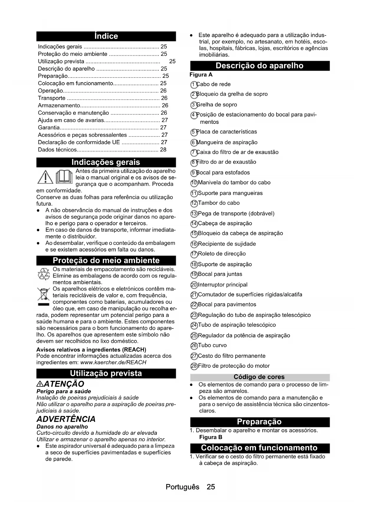 H05VV 2x1,0 GF H05VV 2x1,0 GF Referencia (EU) 6.650-915.0 6.650-915.0 Referencia (GB) 6.652-282.0 6.652-282.0 Referencia (CH) 6.652-281.0 6.652-281.0 Longitud del cable m 12 12Português 25 Índice Indicações gerais Antes da primeira utilização do aparelho leia o manual original e os avisos de se- gurança que o acompanham. Proceda em conformidade. Conserve as duas folhas para referência ou utilização futura. ● A não observância do manual de instruções e dos avisos de segurança pode originar danos no apare- lho e perigo para o operador e terceiros. ● Em caso de danos de transporte, informar imediata- mente o distribuidor. ● Ao desembalar, verifique o conteúdo da embalagem e se existem acessórios em falta ou danos. Proteção do meio ambiente Os materiais de empacotamento são recicláveis. Elimine as embalagens de acordo com os regula- mentos ambientais. Os aparelhos elétricos e eletrónicos contêm ma- teriais recicláveis de valor e, com frequência, componentes como baterias, acumuladores ou óleo que, em caso de manipulação ou recolha er- rada, podem representar um potencial perigo para a saúde humana e para o ambiente. Estes componentes são necessários para o bom funcionamento do apare- lho. Os aparelhos que apresentem este símbolo não devem ser recolhidos no lixo doméstico. Avisos relativos a ingredientes (REACH) Pode encontrar informações actualizadas acerca dos ingredientes em: www.kaercher.de/REACH Utilização prevista 몇 ATENÇÃO Perigo para a saúde Inalação de poeiras prejudiciais à saúde Não utilizar o aparelho para a aspiração de poeiras pre- judiciais à saúde. ADVERTÊNCIA Danos no aparelho Curto-circuito devido a humidade do ar elevada Utilizar e armazenar o aparelho apenas no interior. ● Este aspirador universal é adequado para a limpeza a seco de superfícies pavimentadas e superfícies de parede. ● Este aparelho é adequado para a utilização indus- trial, por exemplo, no artesanato, em hotéis, esco- las, hospitais, fábricas, lojas, escritórios e agências imobiliárias. Descrição do aparelho Figura A 1 Cabo de rede 2 Bloqueio da grelha de sopro 3 Grelha de sopro 4 Posição de estacionamento do bocal para pavi- mentos 5 Placa de características 6 Mangueira de aspiração 7 Caixa do filtro de ar de exaustão 8 Filtro do ar de exaustão 9 Bocal para estofados 10 Manivela do tambor do cabo 11 Suporte para mangueiras 12 Tambor do cabo 13 Pega de transporte (dobrável) 14 Cabeça de aspiração 15 Bloqueio da cabeça de aspiração 16 Recipiente de sujidade 17 Roleto de direcção 18 Suporte de aspiração 19 Bocal para juntas 20 Interruptor principal 21 Comutador de superfícies rígidas/alcatifa 22 Bocal para pavimentos 23 Regulação do tubo de aspiração telescópico 24 Tubo de aspiração telescópico 25 Regulador da potência de aspiração 26 Tubo curvo 27 Cesto do filtro permanente 28 Filtro de protecção do motor Código de cores ● Os elementos de comando para o processo de lim- peza são amarelos. ● Os elementos de comando para a manutenção e para o serviço de assistência técnica são cinzentos- claros. Preparação