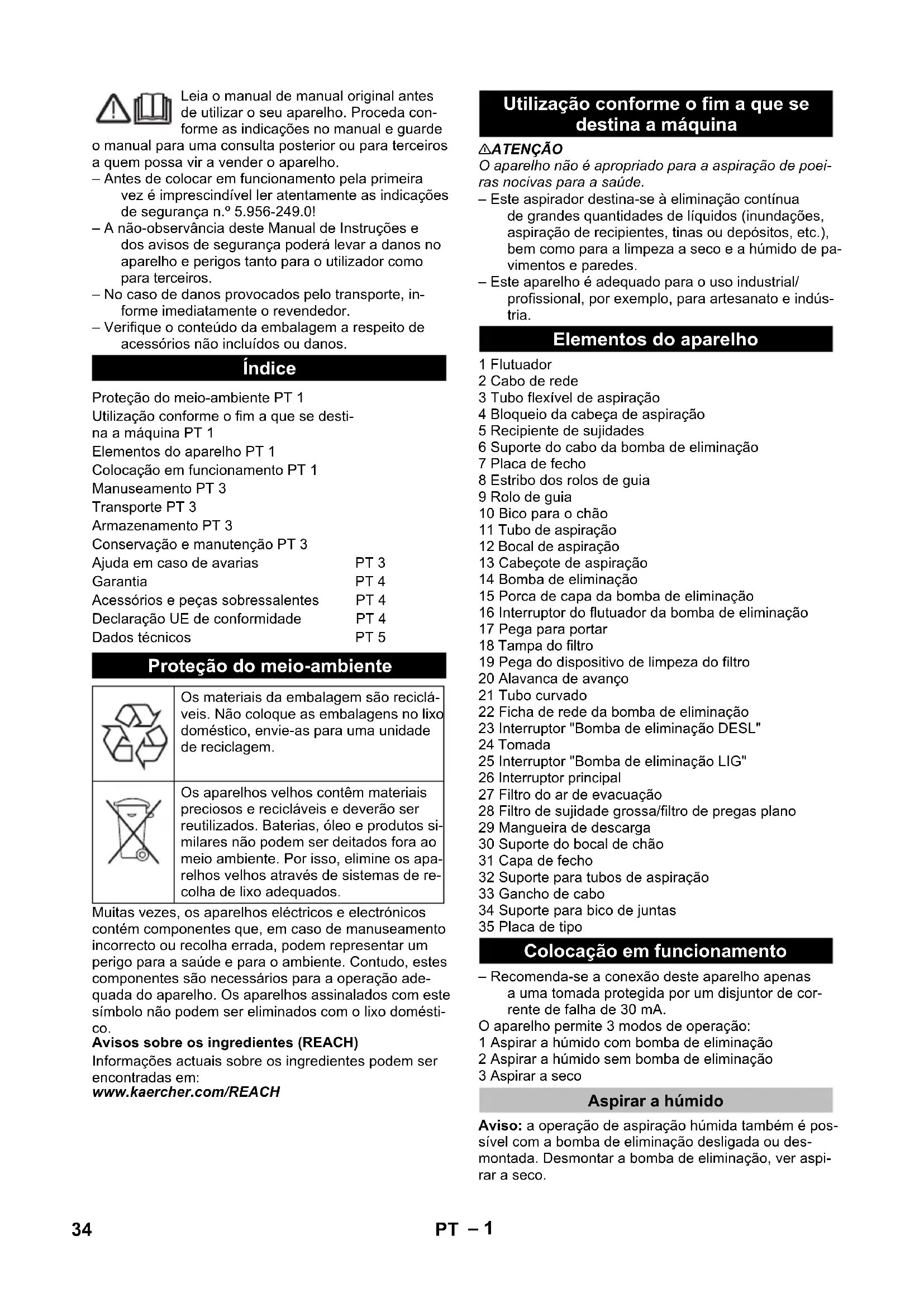 No. de pieza Longitud del ca- ble EU 6.649-413.0 10 m CH 6.649-254.0 10 m 33ES– 1 Leia o manual de manual original antes de utilizar o seu aparelho. Proceda con- forme as indicações no manual e guarde o manual para uma consulta posterior ou para terceiros a quem possa vir a vender o aparelho. – Antes de colocar em funcionamento pela primeira vez é imprescindível ler atentamente as indicações de segurança n.º 5.956-249.0! – A não-observância deste Manual de Instruções e dos avisos de segurança poderá levar a danos no aparelho e perigos tanto para o utilizador como para terceiros. – No caso de danos provocados pelo transporte, in- forme imediatamente o revendedor. – Verifique o conteúdo da embalagem a respeito de acessórios não incluídos ou danos. Muitas vezes, os aparelhos eléctricos e electrónicos contém componentes que, em caso de manuseamento incorrecto ou recolha errada, podem representar um perigo para a saúde e para o ambiente. Contudo, estes componentes são necessários para a operação ade- quada do aparelho. Os aparelhos assinalados com este símbolo não podem ser eliminados com o lixo domésti- co. Avisos sobre os ingredientes (REACH) Informações actuais sobre os ingredientes podem ser encontradas em: www.kaercher.com/REACH 몇 ATENÇÃO O aparelho não é apropriado para a aspiração de poei- ras nocivas para a saúde. – Este aspirador destina-se à eliminação contínua de grandes quantidades de líquidos (inundações, aspiração de recipientes, tinas ou depósitos, etc.), bem como para a limpeza a seco e a húmido de pa- vimentos e paredes. – Este aparelho é adequado para o uso industrial/ profissional, por exemplo, para artesanato e indús- tria. 1 Flutuador 2 Cabo de rede 3 Tubo flexível de aspiração 4 Bloqueio da cabeça de aspiração 5 Recipiente de sujidades 6 Suporte do cabo da bomba de eliminação 7 Placa de fecho 8 Estribo dos rolos de guia 9 Rolo de guia 10 Bico para o chão 11 Tubo de aspiração 12 Bocal de aspiração 13 Cabeçote de aspiração 14 Bomba de eliminação 15 Porca de capa da bomba de eliminação 16 Interruptor do flutuador da bomba de eliminação 17 Pega para portar 18 Tampa do filtro 19 Pega do dispositivo de limpeza do filtro 20 Alavanca de avanço 21 Tubo curvado 22 Ficha de rede da bomba de eliminação 23 Interruptor "Bomba de eliminação DESL" 24 Tomada 25 Interruptor "Bomba de eliminação LIG" 26 Interruptor principal 27 Filtro do ar de evacuação 28 Filtro de sujidade grossa/filtro de pregas plano 29 Mangueira de descarga 30 Suporte do bocal de chão 31 Capa de fecho 32 Suporte para tubos de aspiração 33 Gancho de cabo 34 Suporte para bico de juntas 35 Placa de tipo – Recomenda-se a conexão deste aparelho apenas a uma tomada protegida por um disjuntor de cor- rente de falha de 30 mA. O aparelho permite 3 modos de operação: 1 Aspirar a húmido com bomba de eliminação 2 Aspirar a húmido sem bomba de eliminação 3 Aspirar a seco Aviso: a operação de aspiração húmida também é pos- sível com a bomba de eliminação desligada ou des- montada. Desmontar a bomba de eliminação, ver aspi- rar a seco. Índice Proteção do meio-ambiente PT 1 Utilização conforme o fim a que se desti- na a máquina PT 1 Elementos do aparelho PT 1 Colocação em funcionamento PT 1 Manuseamento PT 3 Transporte PT 3 Armazenamento PT 3 Conservação e manutenção PT 3 Ajuda em caso de avarias PT 3 Garantia PT 4 Acessórios e peças sobressalentes PT 4 Declaração UE de conformidade PT 4 Dados técnicos PT 5 Proteção do meio-ambiente Os materiais da embalagem são reciclá- veis. Não coloque as embalagens no lixo doméstico, envie-as para uma unidade de reciclagem. Os aparelhos velhos contêm materiais preciosos e recicláveis e deverão ser reutilizados. Baterias, óleo e produtos si- milares não podem ser deitados fora ao meio ambiente. Por isso, elimine os apa- relhos velhos através de sistemas de re- colha de lixo adequados. Utilização conforme o fim a que se destina a máquina Elementos do aparelho Colocação em funcionamento Aspirar a húmido 34 PT– 2 Figura Desmontar as tiras da escova. Montar lábios de borracha. Aviso: a parte estruturada dos lábios de borracha deve ser virada para fora. Figura Destravar e retirar o cabeçote de aspiração. Puxar o saco do filtro de papel/ velo para fora pelo lado traseiro. Montar e travar o cabeçote de aspiração. – Para aspirar sujidade húmida é sempre necessário retirar o saco de filtro de papel ou de velo. Figura Destravar e retirar o cabeçote de aspiração. Remover o filtro de membrana. Montar e travar o cabeçote de aspiração. – Na aspiração de sujidade húmida retirar sempre o filtro de membrana. Abrir a cobertura do filtro. Retirar o filtro de pregas. Montar o filtro da sujidade grossa. Fechar a cobertura do filtro; deve engatar de forma audível. Figura Retirar a capa de fecho. Ligar a mangueira de eliminação (diâmetro nomi- nal de 3/4“ ou superior). 몇 CUIDADO Respeitar as normas locais sobre tratamento de esgo- tos. Figura Evacuar a água suja através do tubo de descarga. ADVERTÊNCIA Durante a aspiração, nunca pode ser retirado o filtro de sujidade grossa. – Aspirar a húmido sem bomba de eliminação: Reco- menda-se a utilização de um saco filtro especial (húmido, veja sistemas de filtro). – Ao atingir o nível de líquido máximo, o aparelho desliga automaticamente. – Após terminar a aspiração a húmido: Limpar o flu- tuador, recipiente e eventualmente a bomba de eli- minação com um pano húmido e secar. ADVERTÊNCIA Antes de aspirar a seco: Desmontar a bomba de elimi- nação e montar o filtro de pregas plano. Aviso: para os trabalhos de aspirar a seco deve ser sempre utilizado um filtro de pregas plano. ADVERTÊNCIA Nunca retirar o filtro de pregas plano durante a aspira- ção. – Durante a aspiração de poeira fina pode ser utiliza- do adicionalmente um saco de papel de filtro, um saco