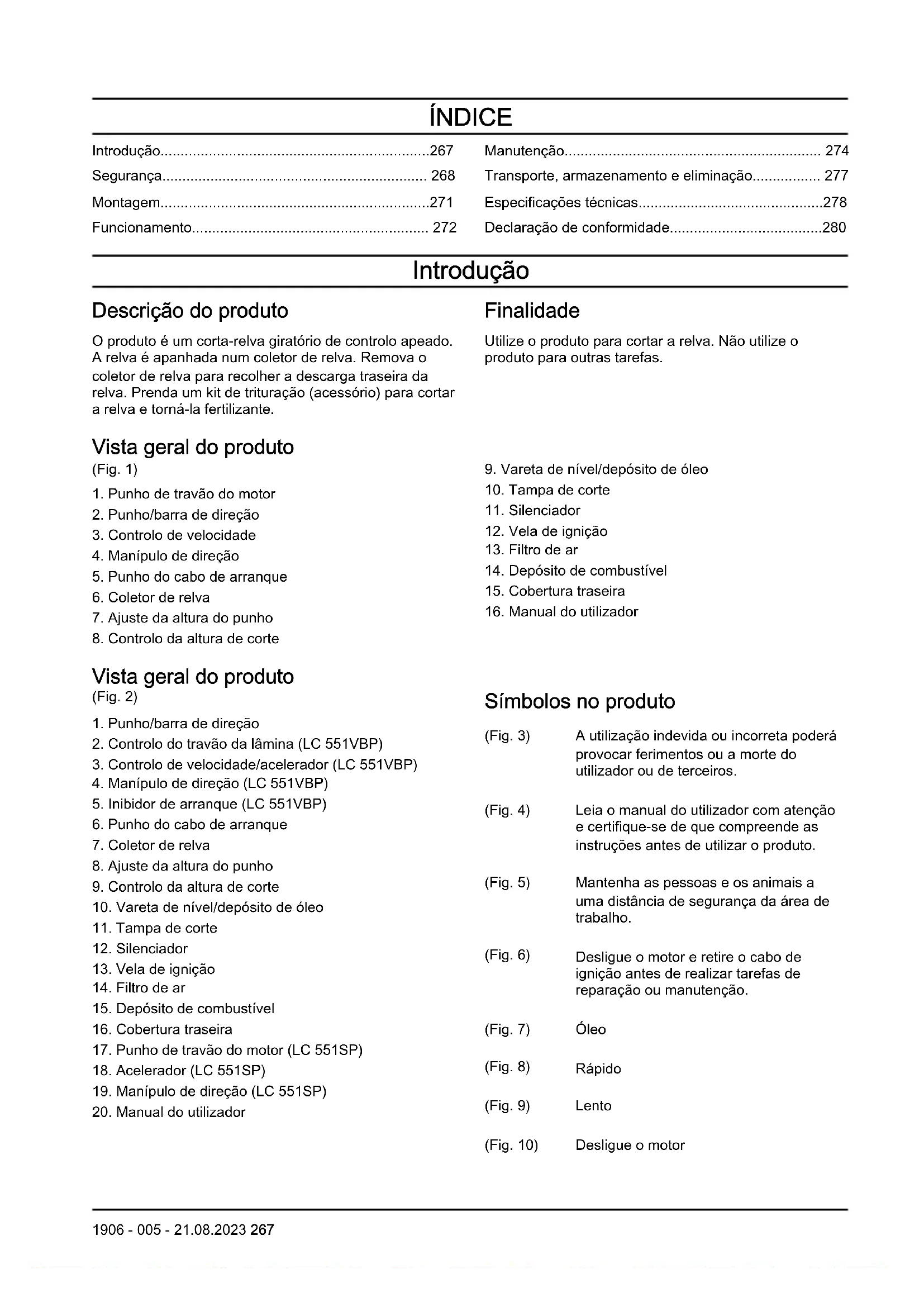 Símbolos no produto (Fig. 3) A utilização indevida ou incorreta poderá provocar ferimentos ou a morte do utilizador ou de terceiros. (Fig. 4) Leia o manual do utilizador com atenção e certifique-se de que compreende as instruções antes de utilizar o produto. (Fig. 5) Mantenha as pessoas e os animais a uma distância de segurança da área de trabalho. (Fig. 6) Desligue o motor e retire o cabo de ignição antes de realizar tarefas de reparação ou manutenção. (Fig. 7) Óleo (Fig. 8) Rápido (Fig. 9) Lento (Fig. 10) Desligue o motor 1906 - 005 - 21.08.2023 267(Fig. 11) Estrangulador (Fig. 12) Embraiagem da lâmina (Fig. 13) Tenha cuidado com objetos projetados e ricochetes. (Fig. 14) Mantenha as mãos e os pés afastados da lâmina rotativa. (Fig. 15) Mantenha as mãos e os pés afastados das peças rotativas. (Fig. 16) Este produto está em conformidade com as diretivas aplicáveis da EU. (Fig. 17) Este produto está em conformidade com os regulamento aplicáveis do Reino Unido. (Fig. 18) Emissão de ruído para a etiqueta ambiental de acordo com as diretivas e regulamentos da União Europeia e do Reino Unido e o regulamento "Protection of the Environment Operations (Noise Control) Regulation 2017" (regulamento de proteção de operações no meio ambiente [controlo do ruído] de 2017) da Nova Gales do Sul. O nível de potência sonora garantido do produto está especificado nas Especificações técnicas na página 278 e na etiqueta. (Fig. 19) Os gases de escape do motor contêm monóxido de carbono, um gás inodoro, tóxico e altamente perigoso. Não utilize o produto em zonas interiores ou espaços fechados. (Fig. 20) Não utilize o produto em zonas interiores ou espaços fechados. (Fig. 21) Risco de explosão. (Fig. 22) Superfície quente (Fig. 23) O motor é fornecido sem óleo. (Fig. 24) Encha com óleo antes de utilizar o produto. (Fig. 25) Não utilize combustível E85. (Fig. 26) Mantenha o produto afastado de chamas abertas. (Fig. 27) Código para leitura. Nota: Os restantes símbolos/autocolantes no produto referem-se a requisitos legais específicos do mercado. Emissões Euro V ATENÇÃO: A adulteração do motor anula a aprovação deste produto pela UE. Responsabilidade pelo produto Como referido nas leis de responsabilidade pelo produto, não somos responsáveis por danos causados pelo nosso produto se: