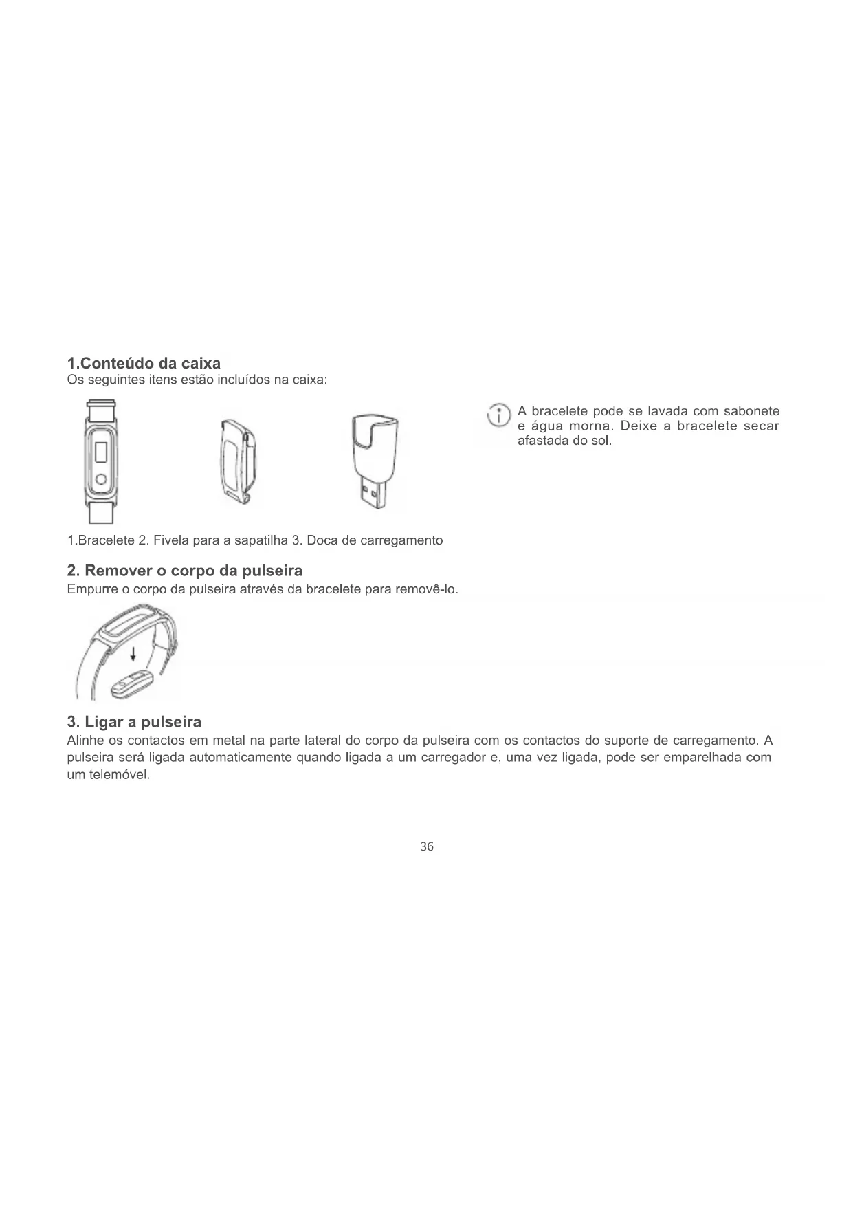 1.Conteúdo da caixa Os seguintes itens estão incluídos na caixa: 1.Bracelete 2. Fivela para a sapatilha 3. Doca de carregamento