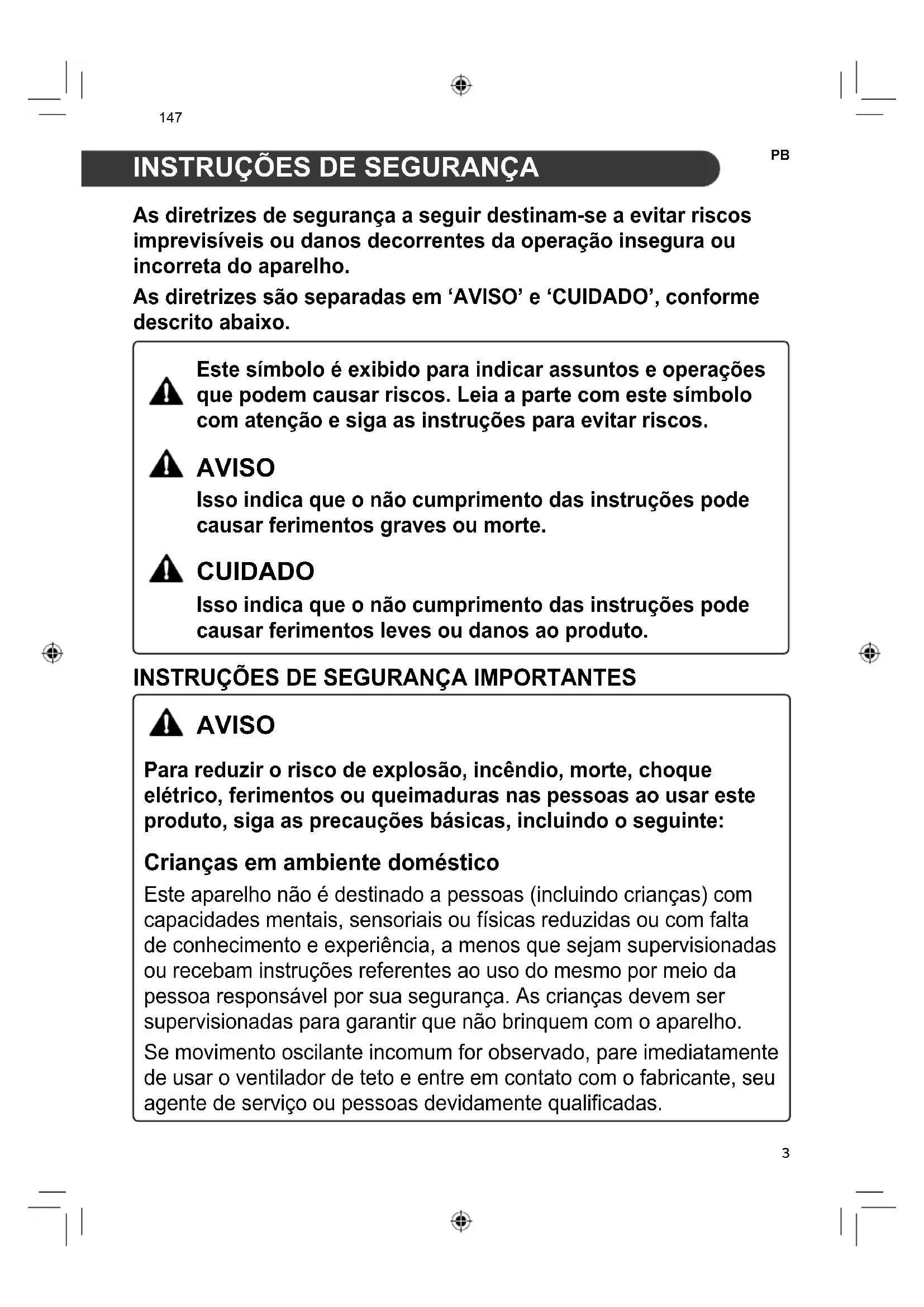 AVISO Para reduzir o risco de explosão, incêndio, morte, choque elétrico, ferimentos ou queimaduras nas pessoas ao usar este produto, siga as precauções básicas, incluindo o seguinte: Crianças em ambiente doméstico Este aparelho não é destinado a pessoas (incluindo crianças) com capacidades mentais, sensoriais ou físicas reduzidas ou com falta de conhecimento e experiência, a menos que sejam supervisionadas ou recebam instruções referentes ao uso do mesmo por meio da pessoa responsável por sua segurança. As crianças devem ser supervisionadas para garantir que não brinquem com o aparelho. Se movimento oscilante incomum for observado, pare imediatamente de usar o ventilador de teto e entre em contato com o fabricante, seu agente de serviço ou pessoas devidamente qualificadas.