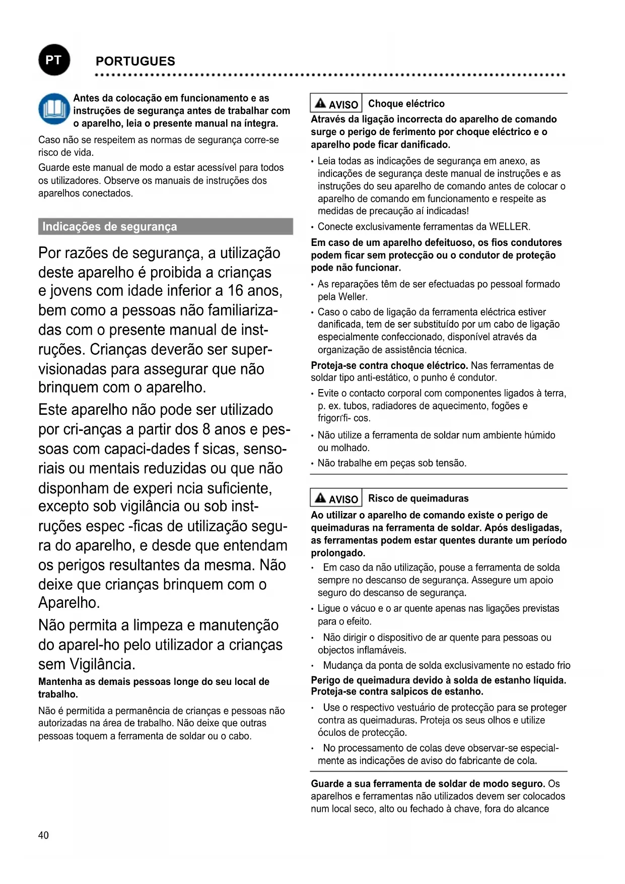 - Conecte exclusivamente ferramentas da WELLER. Em caso de um aparelho defeituoso, os os condutores podem car sem protecção ou o condutor de proteção pode não funcionar.