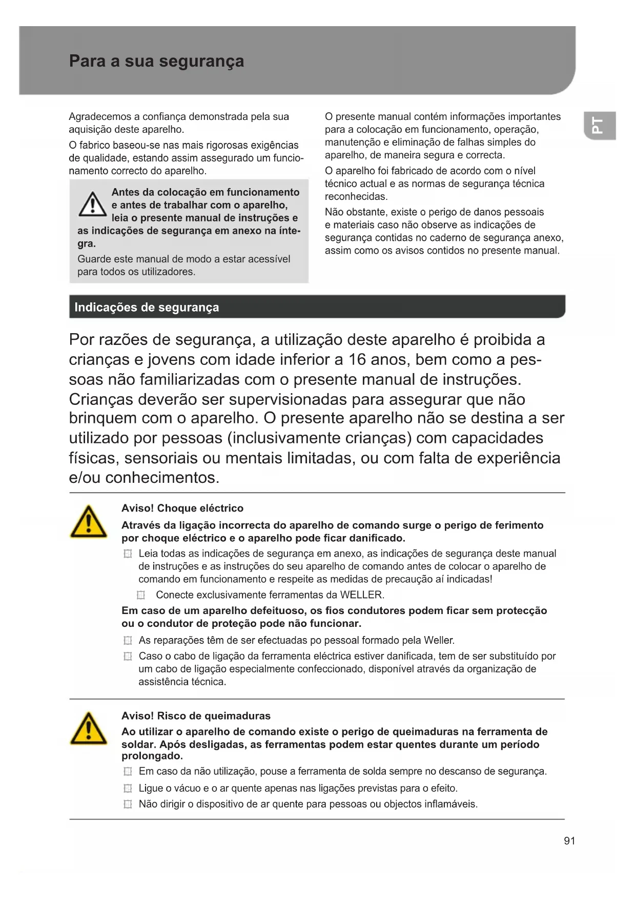IT89 Messaggi d‘errore e problemi Messaggio/Sintomo Possibile causa Misure correttive Display„---“ L‘utensile non è stato riconosciuto Utensile difettoso Vericareilcollegamento dell‘utensile all‘apparecchio Vericarel‘utensilecollegato Nessunafunzionedidisplay (DisplayOff) Assenza della tensione di rete Inserire l‘interruttore di rete Vericarelatensionedirete Controllare la protezione dell‘apparecchio Assenza di vuoto nell‘utensile dissaldante Vakuum nicht angeschlossen Ugello per dissaldare occluso Pompa difettosa Allacciareilessibilepervuoto al collegamento per vuoto Eseguire la manutenzione dell‘ugello per dissaldare con l‘ausilio di un attrezzo per la pulizia Vuotoinsufcientenell‘utensile dissaldante Cartuccialtrantenell‘utensile dissaldante piena Filtro principale pieno Sostituirelacartuccialtrante nell‘utensile dissaldante Sostituirel‘insertoltro principale della stazione di saldatura Nessuna presenza di aria al pistone aria calda Tubo aria non collegato Filtro principale pieno Collegare o controllare il tubo essibilearia Sostituirel‘insertoltro principale della stazione di saldatura Dati Tecnici IT90 Simboli Attenzione! Leggere le Istruzioni d‘uso. Prima di effettuare qualsiasi inter- vento sull‘apparecchio, estrarre sempre il connettore dalla presa. Concezione e postazione di lavoro a norma ESD Compensazione di potenziale Contrassegno CE Marchio di conformità britannico Protezione Trasformatore di sicurezza Saldare Dissaldare Aria calda Smaltimento Iriutidiapparecchiatureelettriche ed elettroniche devono essere raccolti e smaltiti separatamente. Rimuovere le sorgenti luminose dalle apparec- chiature prima di smaltirle. Chiedere alle autorità locali o al rivenditore specializzato dove si trovano i centri di riciclaggio e i punti di raccolta. A seconda dei regolamenti locali, i rivenditori al dettaglio possono essere obbligati a ritirare gratuitamente i riutidiapparecchiatureelettricheed elettroniche. Aiutate a ridurre il fabb- isogno di materie prime riutilizzando ericiclandoipropririutidiapparec- chiature elettriche ed elettroniche. I riutidiapparecchiatureelettricheed elettroniche contengono materiali pre- ziosi e riciclabili che possono avere un impatto negativo sull‘ambiente e sulla vostra salute se non vengono smaltiti in modo ecologico. Cancellare tutti i dati personali che potrebbero esserepresentisulvostroriutodi apparecchiatura prima di procedere allo smaltimento. Iltrisporchidevonoesseretrat- taticomeriutispeciali.Provve- dere allo smaltimento della parti dell‘apparecchiosostituite,deiltri o delle vecchie apparecchiature nel rispetto delle normative vigenti nel proprio Paese. Garanzia I diritti di reclamo dell‘acquirente per eventuali difetti decadono dopo un anno dalla consegna. Tale condizione non si applica ai diritti di recesso dell‘acquirente secondo §§ 478, 479 BGB. Il produttore risponde della garanzia fornita solo se la garanzia di qualità e di durata è stata fornita dal produttore per iscritto e con l‘impiego del termine „Garanzia“. La garanzia decadrà in caso di utilizzo non con- formeoqualorapersonenonqualicateabbiano effettuato interventi. Conriservadimodichetecniche. Per ulteriori informazioni: www.weller-tools.com. Dati Tecnici IT91 Para a sua segurança Agradecemosaconançademonstradapelasua aquisição deste aparelho. O fabrico baseou-se nas mais rigorosas exigências de qualidade, estando assim assegurado um funcio- namento correcto do aparelho. Antes da colocação em funcionamento e antes de trabalhar com o aparelho, leia o presente manual de instruções e as indicações de segurança em anexo na ínte- gra. Guardeestemanualdemodoaestaracessível para todos os utilizadores. O presente manual contém informações importantes para a colocação em funcionamento, operação, manutenção e eliminação de falhas simples do aparelho, de maneira segura e correcta. Oaparelhofoifabricadodeacordocomonível técnico actual e as normas de segurança técnica reconhecidas. Não obstante, existe o perigo de danos pessoais e materiais caso não observe as indicações de segurança contidas no caderno de segurança anexo, assim como os avisos contidos no presente manual. Indicações de segurança Por razões de segurança, a utilização deste aparelho é proibida a crianças e jovens com idade inferior a 16 anos, bem como a pes- soas não familiarizadas com o presente manual de instruções. Crianças deverão ser supervisionadas para assegurar que não brinquem com o aparelho. O presente aparelho não se destina a ser utilizado por pessoas (inclusivamente crianças) com capacidades físicas,sensoriaisoumentaislimitadas,oucomfaltadeexperiência e/ou conhecimentos. Aviso! Choque eléctrico Através da ligação incorrecta do aparelho de comando surge o perigo de ferimento por choque eléctrico e o aparelho pode car danicado. Leia todas as indicações de segurança em anexo, as indicações de segurança deste manual de instruções e as instruções do seu aparelho de comando antes de colocar o aparelho de comandoemfuncionamentoerespeiteasmedidasdeprecauçãoaíindicadas! Conecte exclusivamente ferramentas da WELLER. Em caso de um aparelho defeituoso, os os condutores podem car sem protecção ou o condutor de proteção pode não funcionar. As reparações têm de ser efectuadas po pessoal formado pela Weller. Casoocabodeligaçãodaferramentaeléctricaestiverdanicada,temdesersubstituídopor umcabodeligaçãoespecialmenteconfeccionado,disponívelatravésdaorganizaçãode assistência técnica. Aviso! Risco de queimaduras Ao utilizar o aparelho de comando existe o perigo de queimaduras na ferramenta de soldar. Após desligadas, as ferramentas podem estar quentes durante um período prolongado. Em caso da não utilização, pouse a ferramenta de solda sempre no descanso de segurança. Ligueovácuoeoarquenteapenasnasligaçõesprevistasparaoefeito. Nãodirigirodispositivodearquenteparapessoasouobjectosinam
