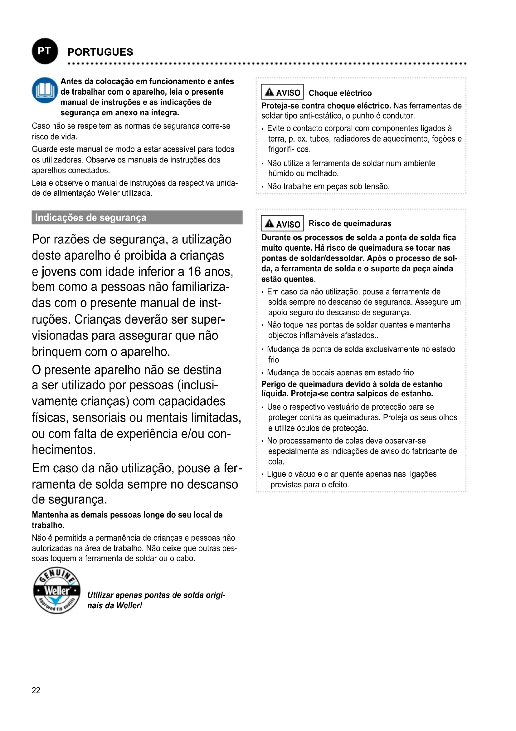 ramenta de solda sempre no descanso de segurança. Mantenha as demais pessoas longe do seu local de trabalho. Não é permitida a permanência de crianças e pessoas não autorizadas na área de trabalho. Não deixe que outras pes- soas toquem a ferramenta de soldar ou o cabo. Utilizar apenas pontas de solda origi- nais da Weller! AVISO Choque eléctrico Proteja-se contra choque eléctrico. Nas ferramentas de soldar tipo anti-estático, o punho é condutor.