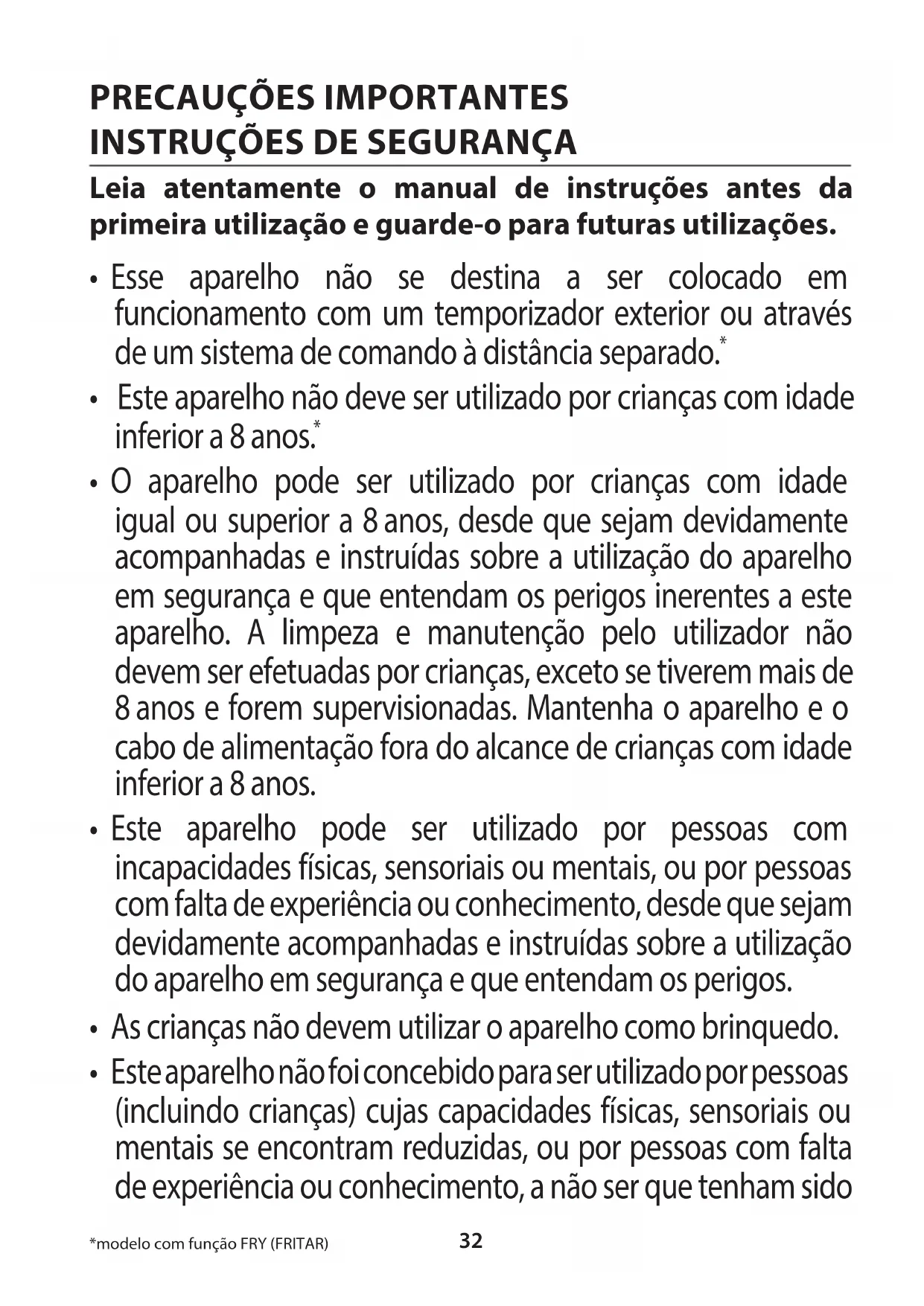 - Este aparelho não foi concebido para ser utilizado por pessoas (incluindo crianças) cujas capacidades físicas, sensoriais ou mentais se encontram reduzidas, ou por pessoas com falta de experiência ou conhecimento, a não ser que tenham sido *modelo com função FRY (FRITAR)33