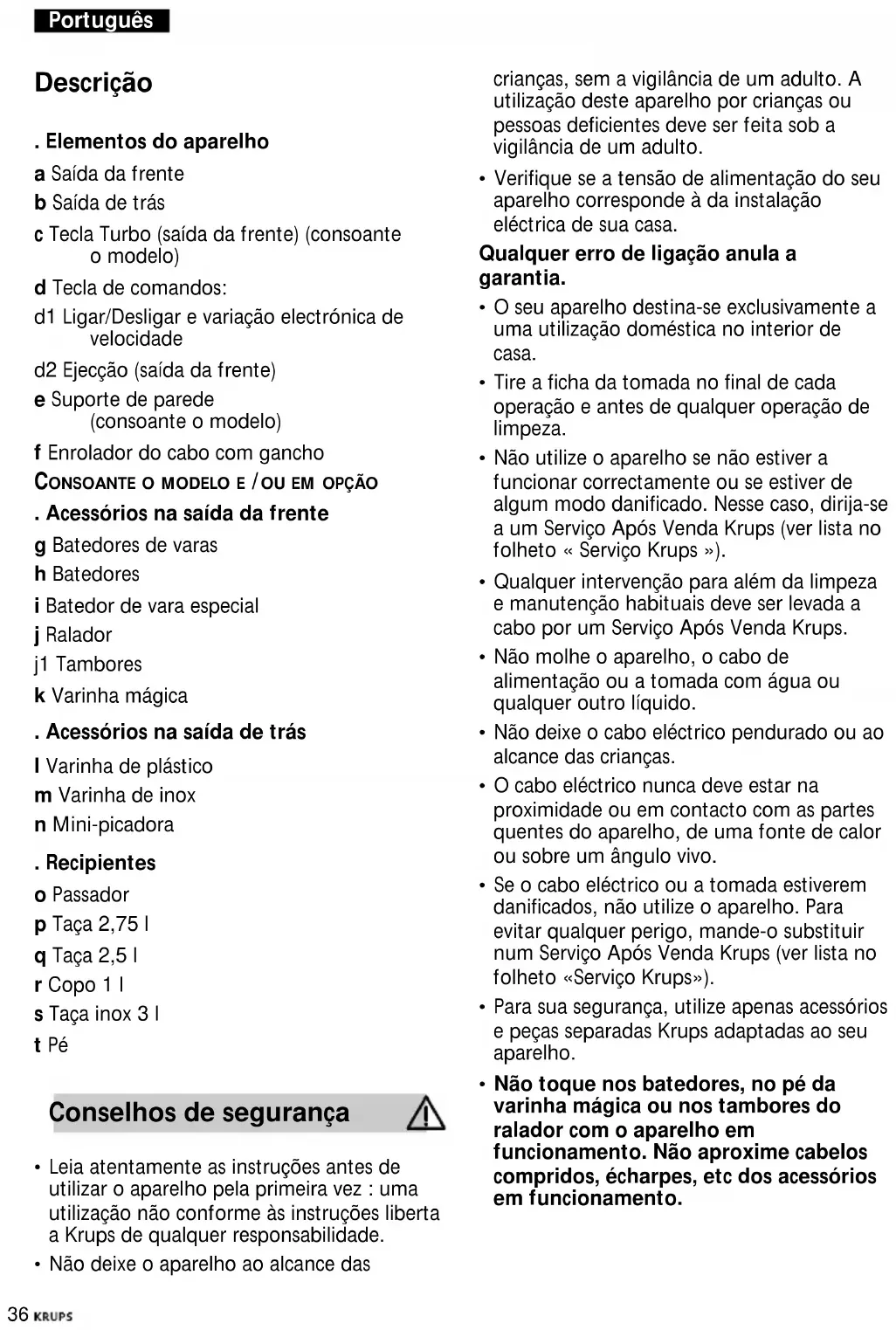 - Para sua segurança, utilize apenas acessórios e peças separadas Krups adaptadas ao seu aparelho.