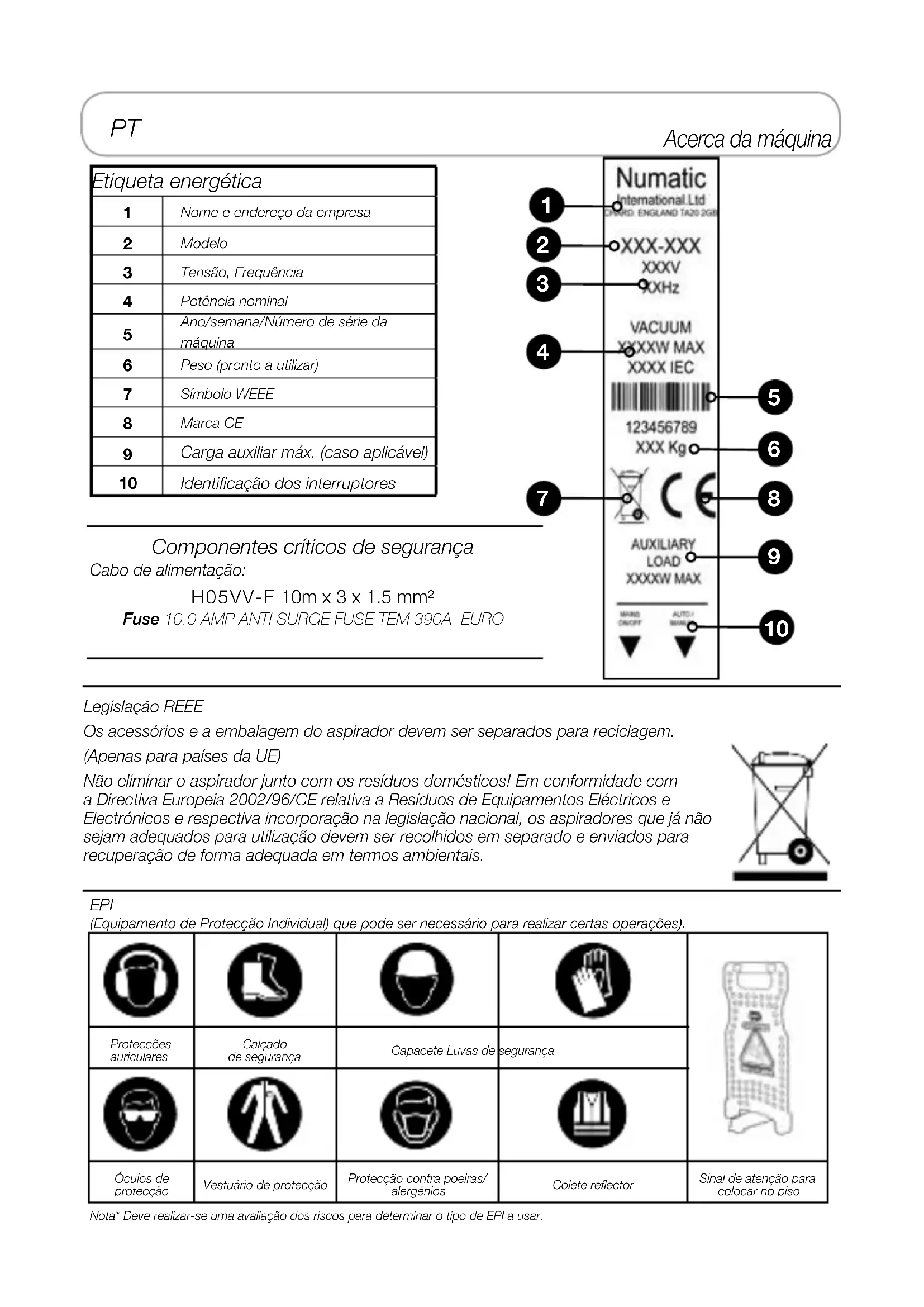 Acerca da máquina Componentes críticos de segurança Cabo de alimentação: H05VV-F 10m x 3 x 1.5 mm² Fuse 10.0 AMP ANTI SURGE FUSE TEM 390A EURO Protecções auricularesCalçado de segurançaCapacete Luvas de segurançaÓculos de protecçãoVestuário de protecçãoProtecção contra poeiras/alergéniosColete reectorSinal de atenção para colocar no piso PTDEVE