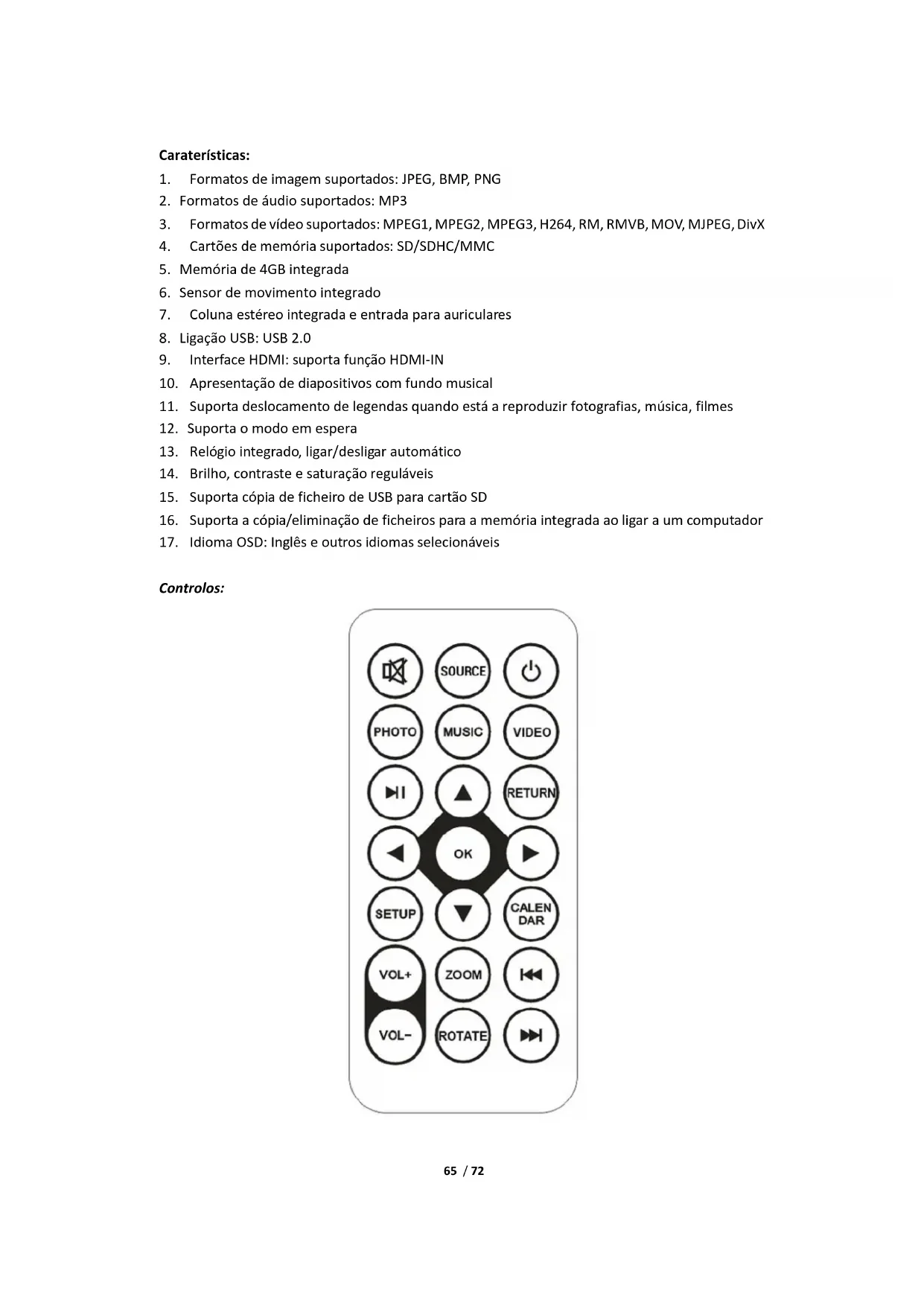 Controlos:66 / 72 LIGAR/DESLIGAR Ligar/desligar. SEM SOM Sem Som SOURCE Entrada de sinal HDMI/AV/DMP PHOTO Modo de reprodução de fotografia diretamente MUSIC Modo de reprodução de música diretamente VIDEO Modo de reprodução de vídeo diretamente