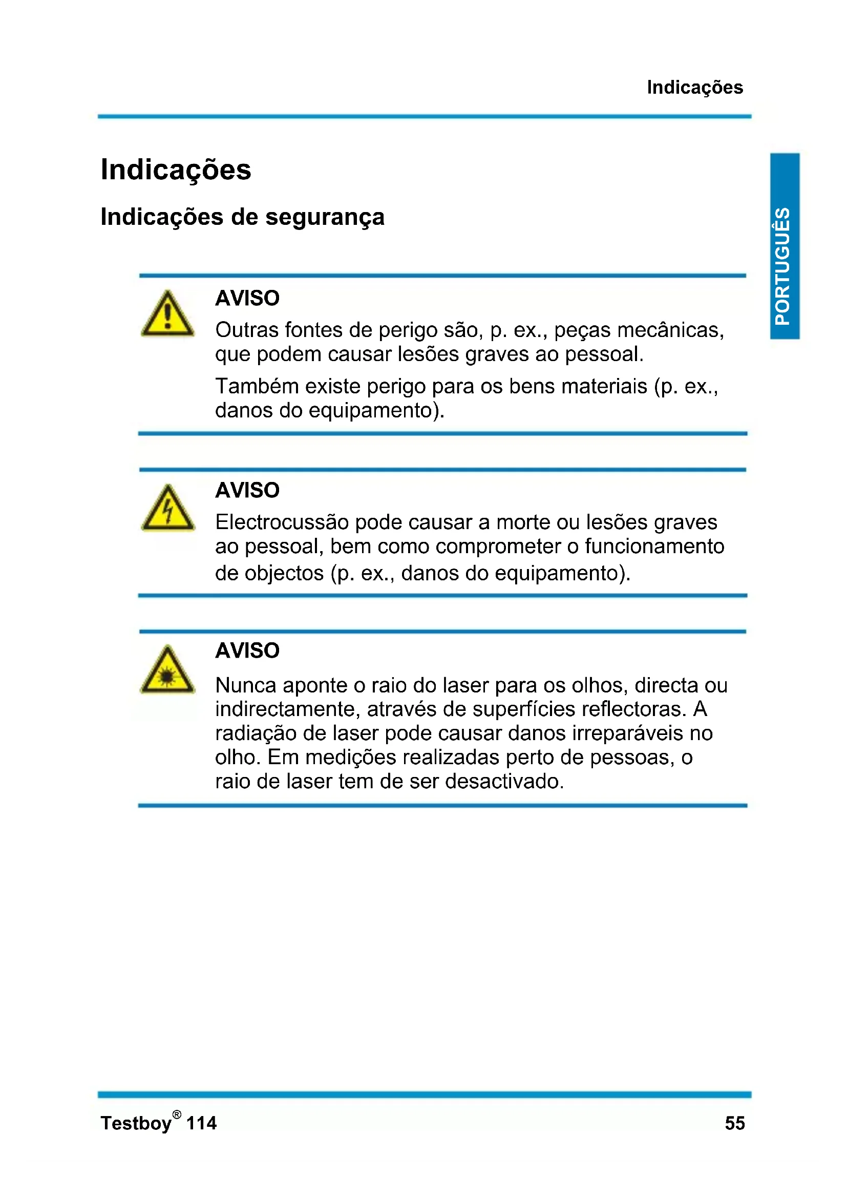 AVISO Nunca aponte o raio do laser para os olhos, directa ou indirectamente, através de superfícies reflectoras. A radiação de laser pode causar danos irreparáveis no olho. Em medições realizadas perto de pessoas, o raio de laser tem de ser desactivado.Indicações 56 Testboy