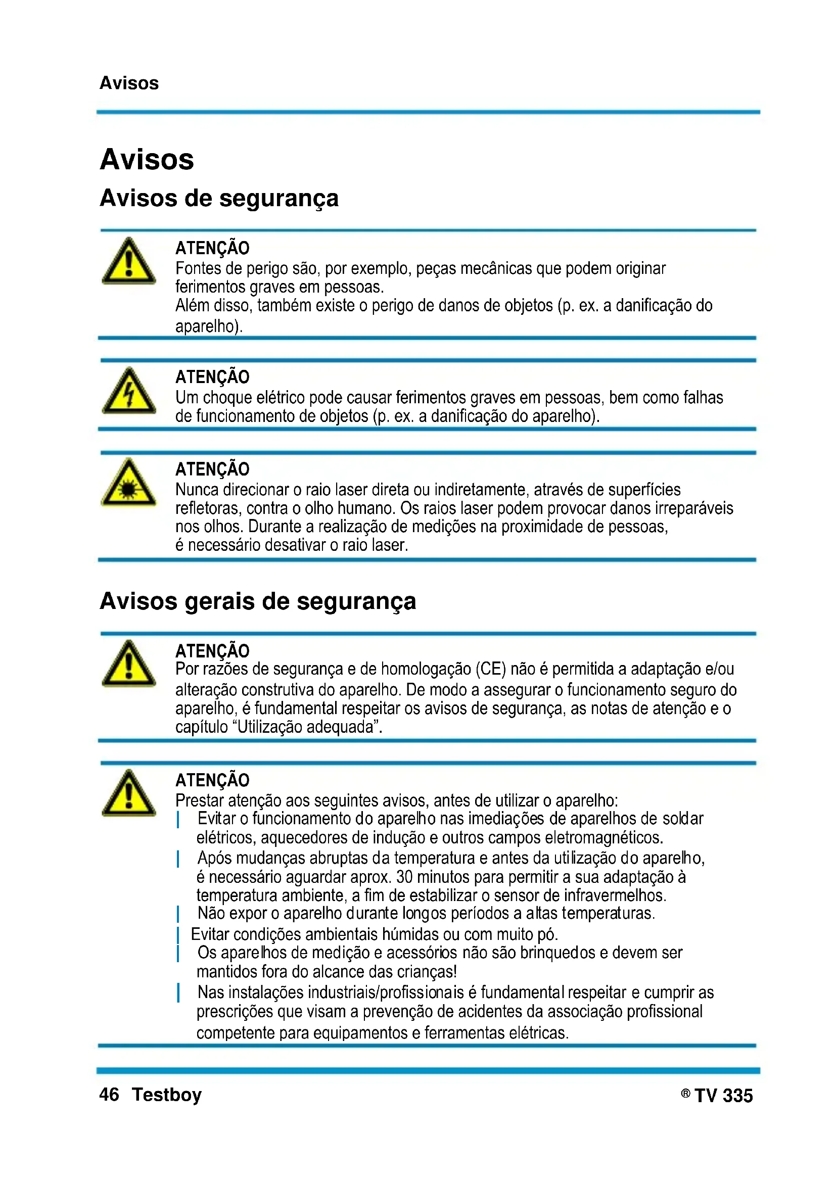 ATENÇÃO Prestar atenção aos seguintes avisos, antes de utilizar o aparelho: | Evitar o funcionamento do aparelho nas imediações de aparelhos de soldar elétricos, aquecedores de indução e outros campos eletromagnéticos. | Após mudanças abruptas da temperatura e antes da utilização do aparelho, é necessário aguardar aprox. 30 minutos para permitir a sua adaptação à temperatura ambiente, a fim de estabilizar o sensor de infravermelhos. | Não expor o aparelho durante longos períodos a altas temperaturas. | Evitar condições ambientais húmidas ou com muito pó. | Os aparelhos de medição e acessórios não são brinquedos e devem ser mantidos fora do alcance das crianças! | Nas instalações industriais/profissionais é fundamental respeitar e cumprir as prescrições que visam a prevenção de acidentes da associação profissional competente para equipamentos e ferramentas elétricas.Avisos