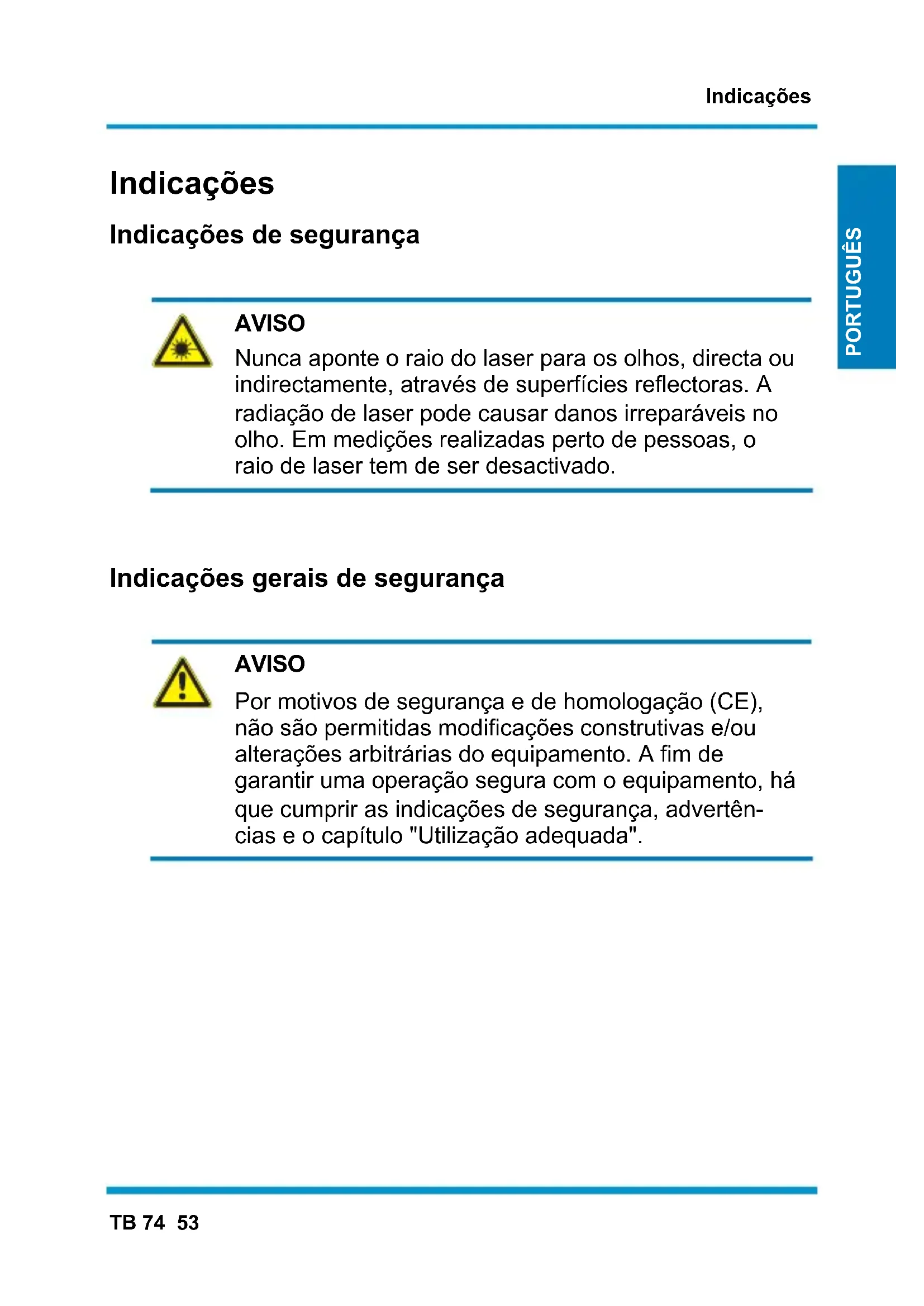 TB 74 AVISO Antes de utilizar o equipamento, observe as seguintes indicações: | Evite operar o equipamento perto de aparelhos de soldar eléctricos, aquecedores por indução e outros campos electromagnéticos. | Não sujeite o equipamento a temperaturas eleva- das por muito tempo. | Evite ambientes poeirentos e húmidos. | Equipamentos de medição e os seus acessórios não são brinquedos e devem ser mantidos afasta- dos das crianças! | Em instalações industriais, há que cumprir as nor- mas de prevenção de acidentes da união das asso- ciações profissionais industriais para instalações eléctricas e meios de produção.