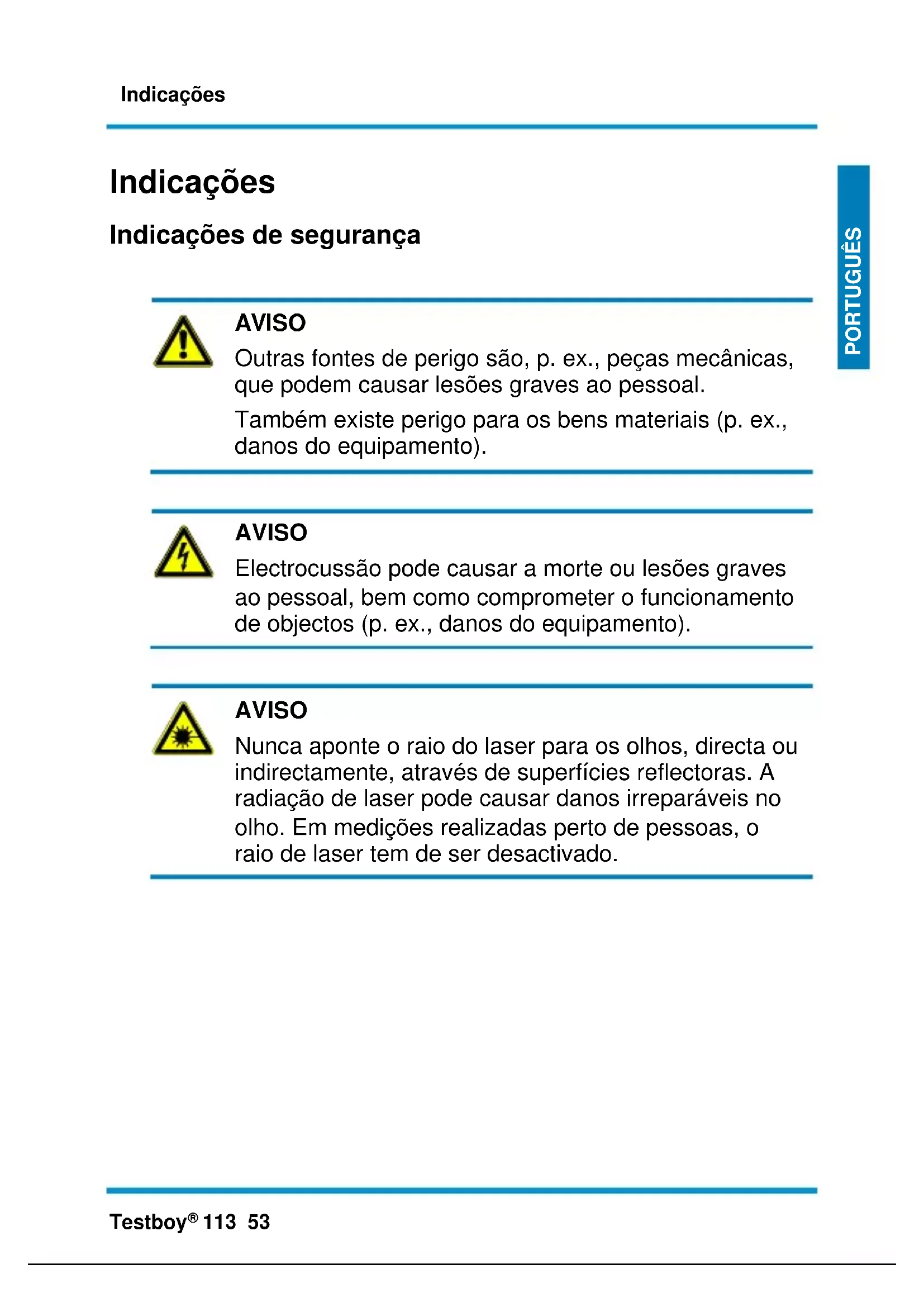 AVISO Nunca aponte o raio do laser para os olhos, directa ou indirectamente, através de superfícies reflectoras. A radiação de laser pode causar danos irreparáveis no olho. Em medições realizadas perto de pessoas, o raio de laser tem de ser desactivado.Indicações 54 Testboy