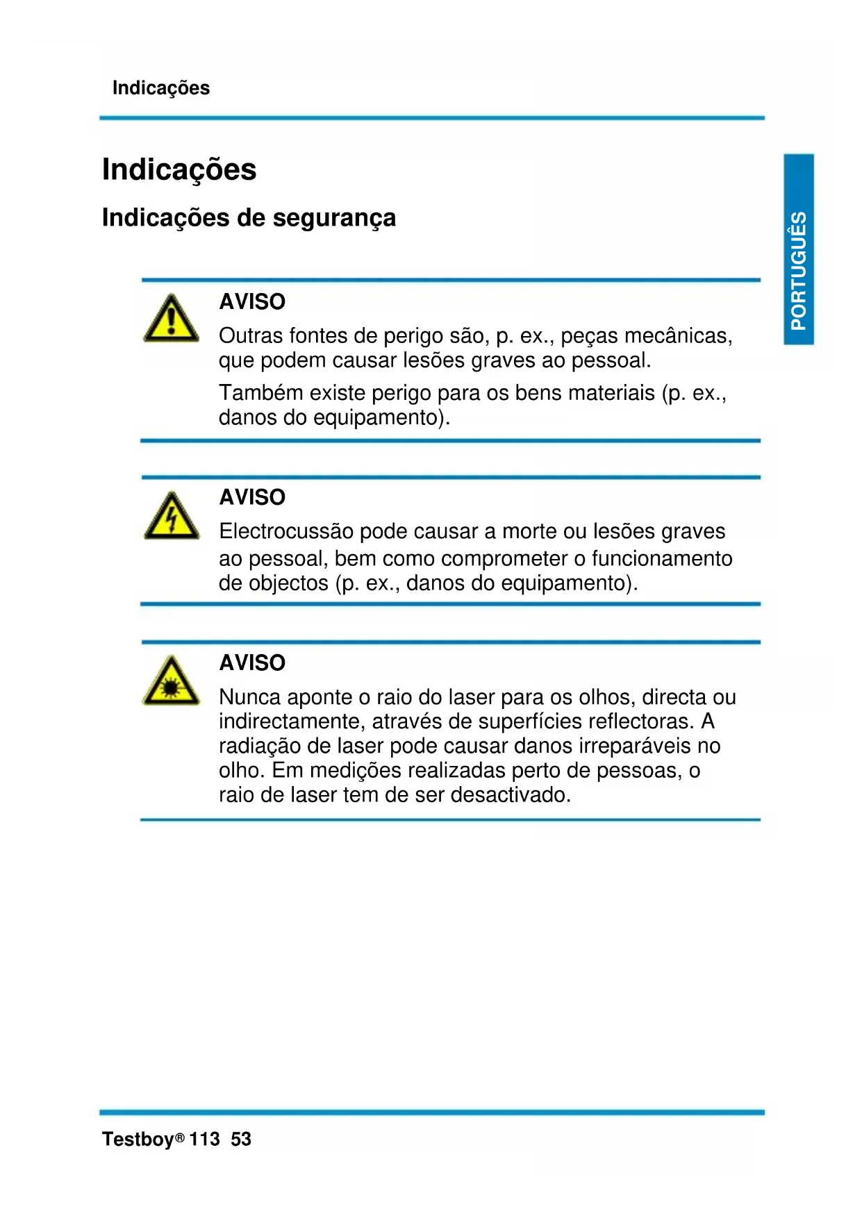 AVISO Nunca aponte o raio do laser para os olhos, directa ou indirectamente, através de superfícies reflectoras. A radiação de laser pode causar danos irreparáveis no olho. Em medições realizadas perto de pessoas, o raio de laser tem de ser desactivado.Indicações 54 Testboy