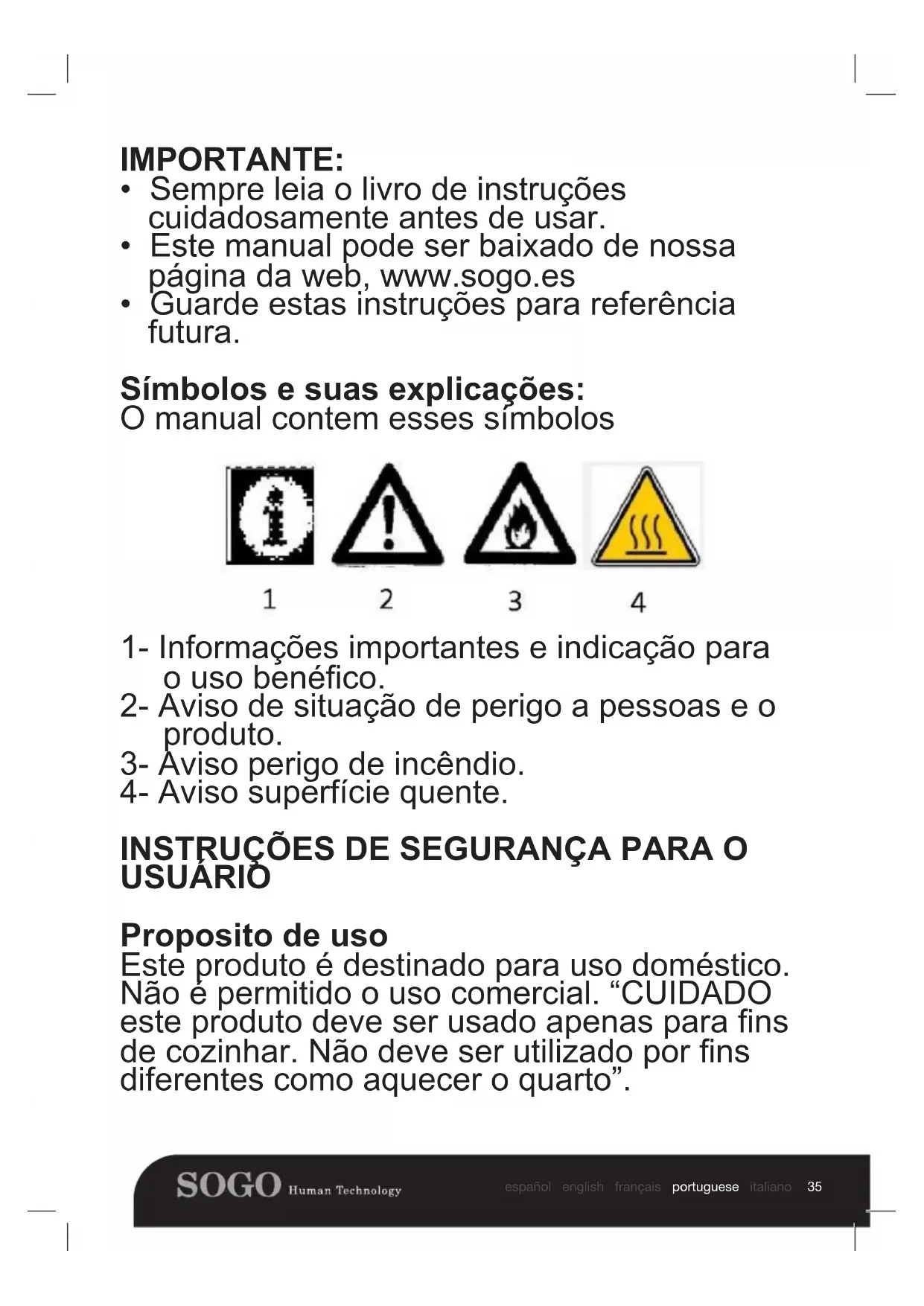 INSTRUÇÕES DE SEGURANÇA PARA O USUÁRIO Proposito de uso Este produto é destinado para uso doméstico. Não é permitido o uso comercial. “CUIDADO este produto deve ser usado apenas para ns de cozinhar. Não deve ser utilizado por ns diferentes como aquecer o quarto”.36 español english français portuguese italiano