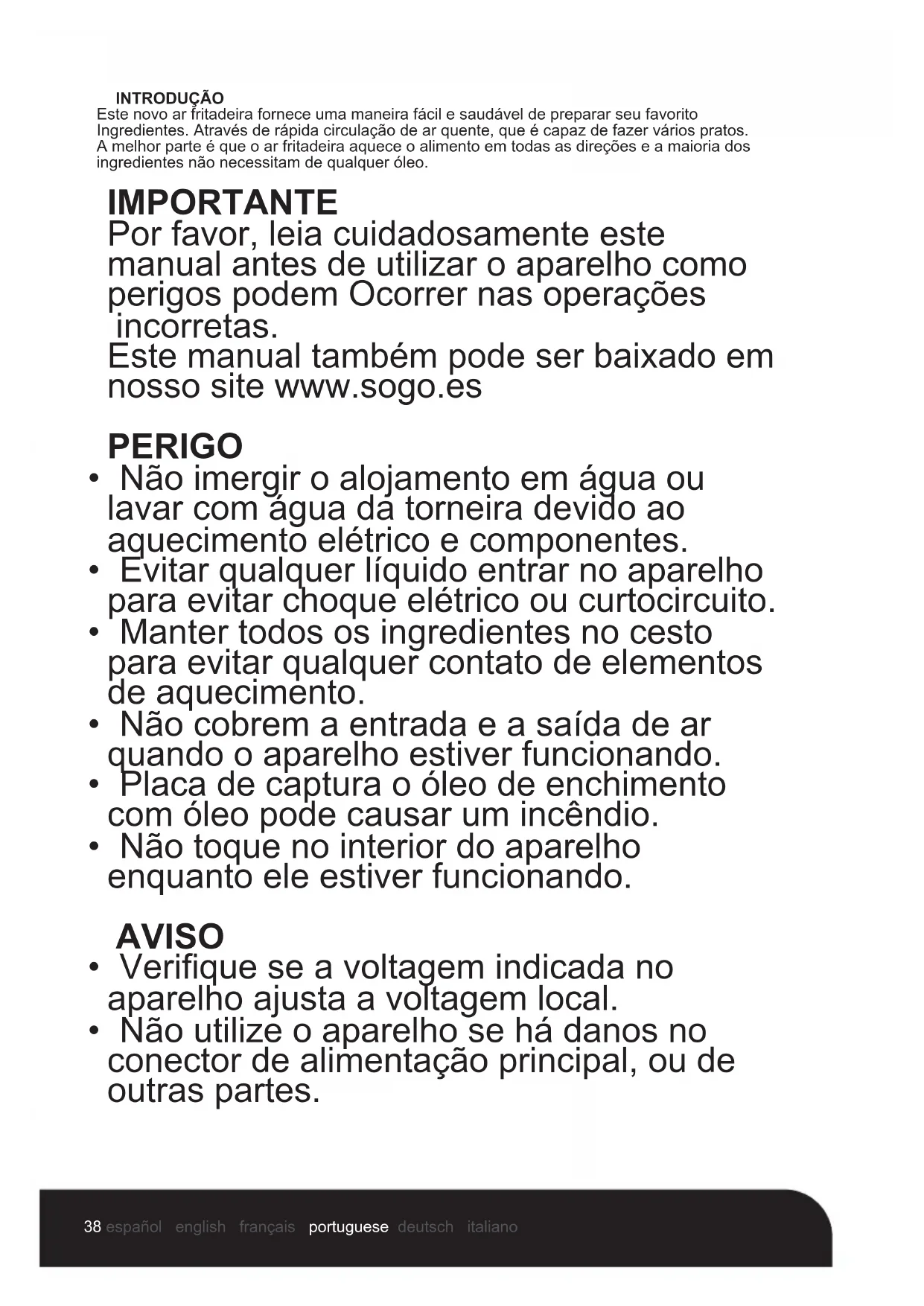 Utilizando a fritadeira a ar da churrasqueira sem pré-ajustes Uma vez que você esteja familiarizado com a fritadeira a areira Rotisserie você pode querer experimentar por conta própria. Aviso Nunca use um recipiente de cozedura cheio com óleo de cozinha ou qualquer outro líquido com esta unidade! Risco de incêndio ou ferimentos pessoais podem resultar.44 español english français portuguese deutsch italiano