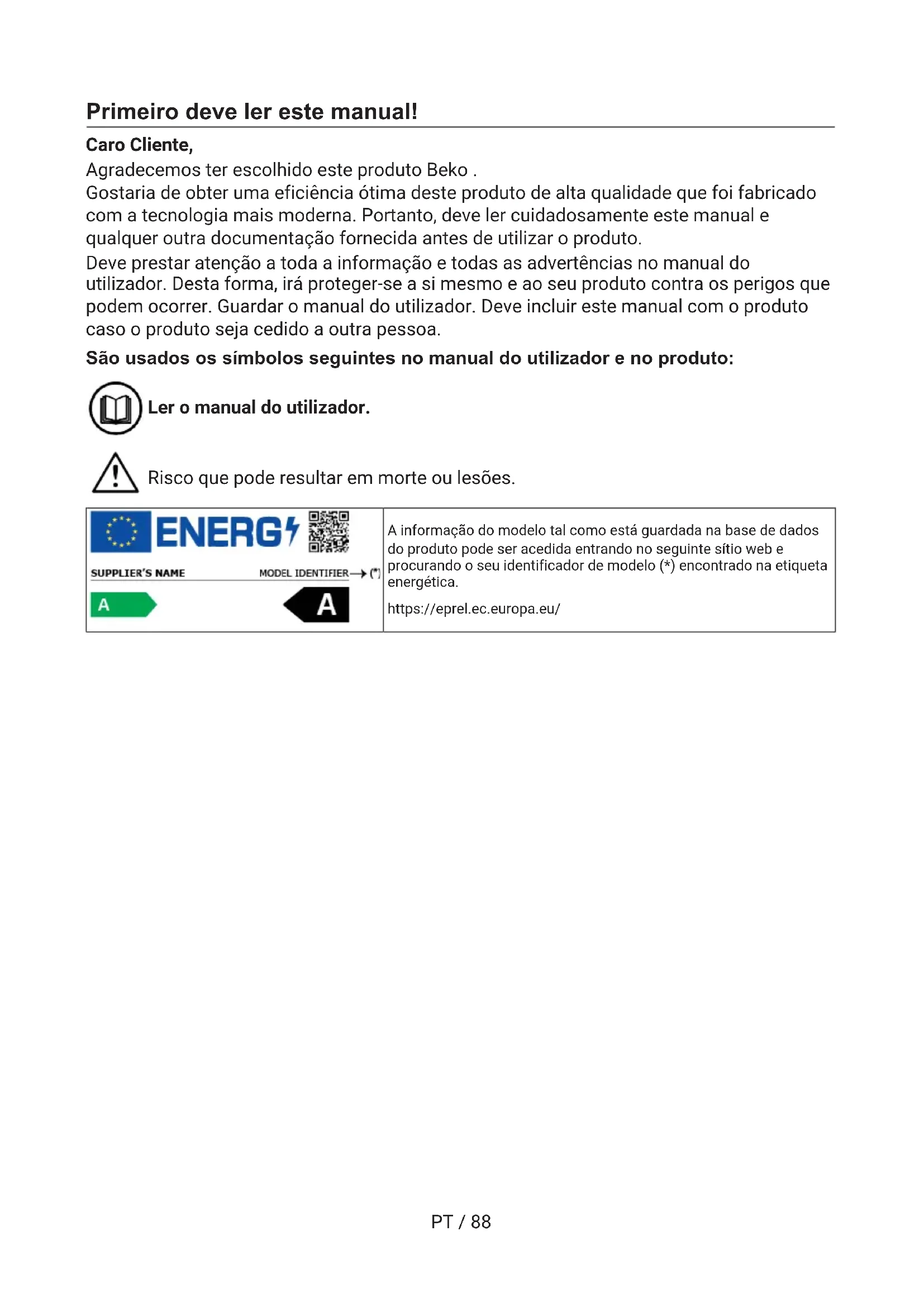 Informazioni sulla classificazione dell’imballaggi Scansiona il Qrcode che si trova sull’imbal- lo del prodotto per trovare tutte le informa- zioni relative all’imballo e come gestirne il suo corretto smaltimento.PT / 88 Primeiro deve ler este manual! Caro Cliente, Agradecemos ter escolhido este produto Beko . Gostaria de obter uma eficiência ótima deste produto de alta qualidade que foi fabricado com a tecnologia mais moderna. Portanto, deve ler cuidadosamente este manual e qualquer outra documentação fornecida antes de utilizar o produto. Deve prestar atenção a toda a informação e todas as advertências no manual do utilizador. Desta forma, irá proteger-se a si mesmo e ao seu produto contra os perigos que podem ocorrer. Guardar o manual do utilizador. Deve incluir este manual com o produto caso o produto seja cedido a outra pessoa. São usados os símbolos seguintes no manual do utilizador e no produto: Ler o manual do utilizador. Risco que pode resultar em morte ou lesões. A informação do modelo tal como está guardada na base de dados do produto pode ser acedida entrando no seguinte sítio web e procurando o seu identificador de modelo (*) encontrado na etiqueta energética. https://eprel.ec.europa.eu/PT / 89 Índice 1 Instruções de segurança................ 90