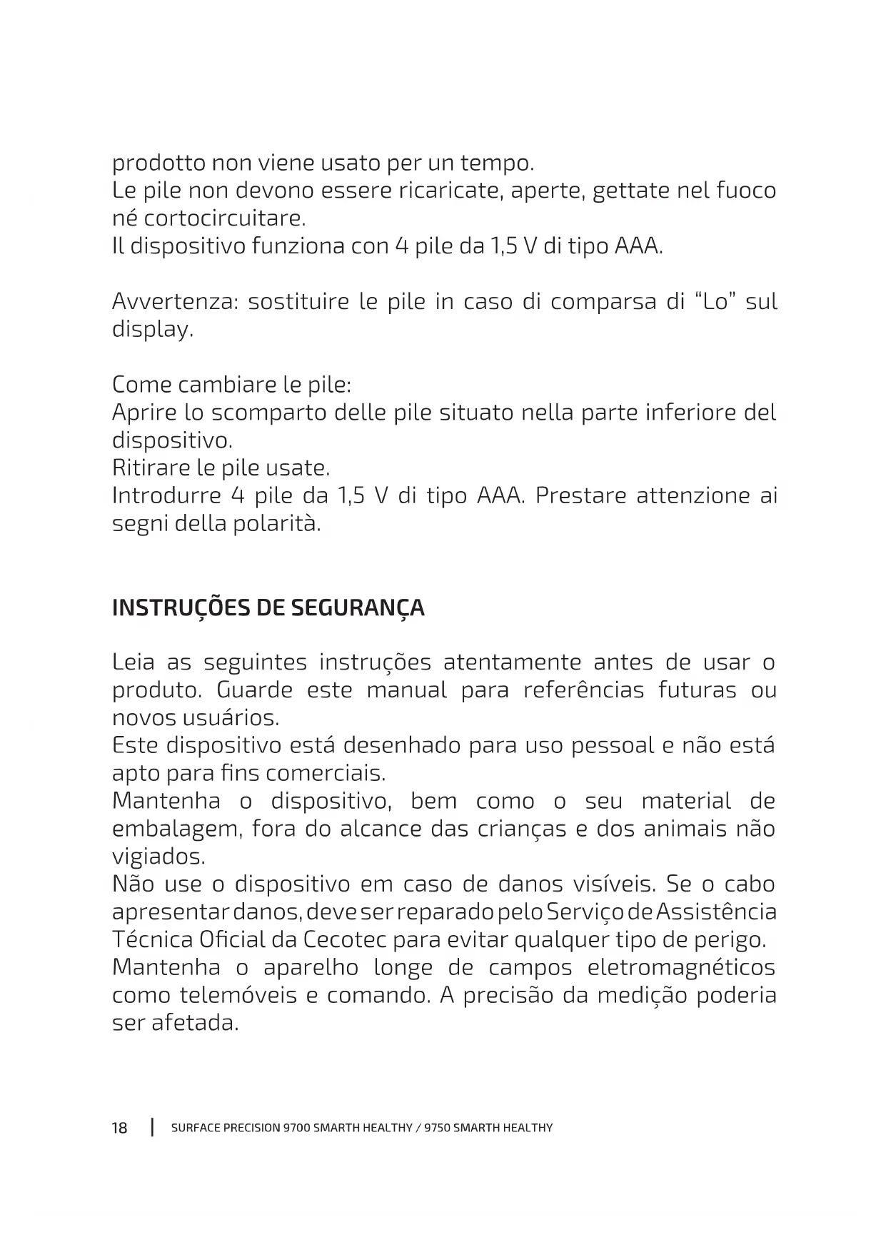 Leia as seguintes instruções atentamente antes de usar o produto. Guarde este manual para referências futuras ou novos usuários. Este dispositivo está desenhado para uso pessoal e não está apto para ns comerciais. Mantenha o dispositivo, bem como o seu material de embalagem, fora do alcance das crianças e dos animais não vigiados. Não use o dispositivo em caso de danos visíveis. Se o cabo apresentar danos, deve ser reparado pelo Serviço de Assistência Técnica Ocial da Cecotec para evitar qualquer tipo de perigo. Mantenha o aparelho longe de campos eletromagnéticos como telemóveis e comando. A precisão da medição poderia ser afetada.SURFACE PRECISION 9700 SMARTH HEALTHY / 9750 SMARTH HEALTHY