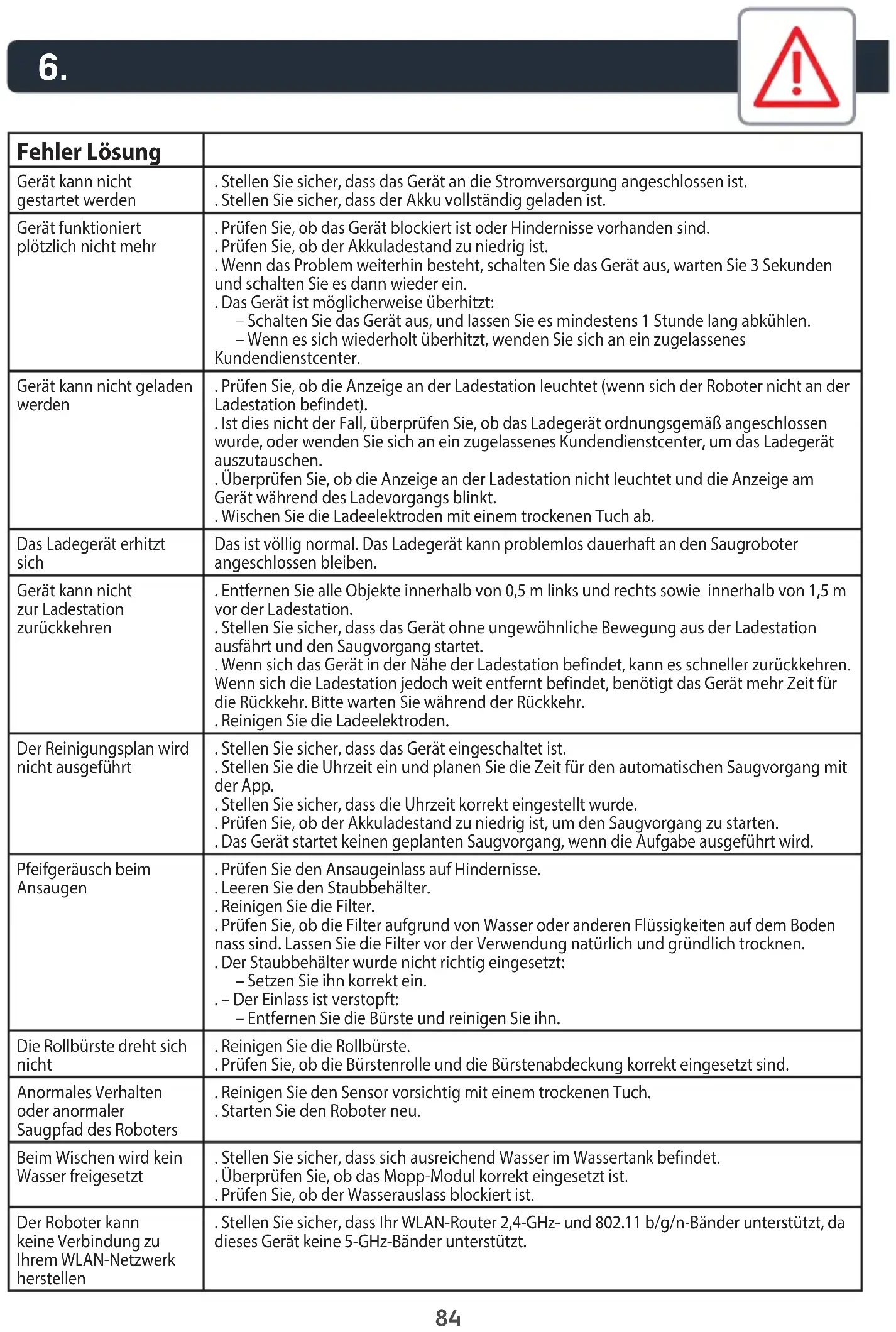 Avaria Solução Não é possível iniciar o robot . Certifique-se de que o robot está ligado à corrente. . Certifique-se de que a bateria está totalmente carregada. O robot deixa de funcionar . Verifique se o robot está preso ou bloqueado por obstáculos. . Verifique se a bateria está demasiado fraca. . Se o problema persistir, desligue-o, aguarde 3 segundos e, em seguida, volte a ligá-lo. . O aparelho pode estar em sobreaquecimento: – Desligue o aparelho e deixe-o arrefecer durante, pelo menos, 1 hora. – Caso o aparelho volte a sobreaquecer em diversas ocasiões, contacte um Serviço de Assistência Técnica autorizado.” Não é possível carregar o robot . Verifique se o indicador na base de carregamento está aceso (quando o robot não estiver na base de carregamento). . Se não for o caso, verifique se o carregador está ligado corretamente ou contacte um Serviço de Assistência Técnica autorizado para substituir o carregador. . Verifique se o indicador na base de carregamento está desligado e se o indicador no robot está a piscar durante o carregamento. . Limpe o pó dos polos de carregamento com um pano seco. O carregador está a aquecer Isto é perfeitamente normal. O aspirador pode ficar ligado permanentemente ao carregador sem qualquer risco. O robot não consegue voltar à base de carregamento . Afaste os objetos da base de carregamento numa distância de, pelo menos, 0,5m dos lados esquerdo e direito e 1,5m à frente. . Certifique-se de que o robot começa a limpar a partir da base de carregamento sem movimentos anómalos. . Quando o robot está perto da base de carregamento, pode regressar mais rapidamente. Contudo, se a base de carregamento estiver longe, o robot precisa de mais tempo para regressar. Aguarde pelo seu regresso. . Limpe os polos de carregamento. O plano de limpeza não é executado . Certifique-se de que o robot foi ligado. . Através da aplicação, defina e programe a hora para a limpeza automática. . Certifique-se de que a hora programada foi definida corretamente. . Verifique se a carga da bateria é demasiado baixa para iniciar a limpeza. . O robot não inicia uma limpeza programada se a tarefa estiver a ser realizada. Ruído na sucção . Verifique se existe algo a obstruir a entrada de sucção. . Esvazie o depósito do pó. . Limpe os filtros. . Verifique se os filtros estão molhados por terem absorvido água ou outros líquidos do chão. Deixe que os filtros sequem naturalmente e totalmente antes de os utilizar. . O coletor de pó não está instalado corretamente: – Volte a colocá-lo de forma correta. . A cabeça de aspiração está obstruída: – Retire a escova e limpe-a. A escova rotativa não roda . Limpe a escova rotativa. . Verifique se a escova rotativa e a cobertura da escova estão instaladas corretamente. Comportamento ou percurso de limpeza do robot efetuado de forma anómala . Limpe cuidadosamente o sensor com um pano seco. . Reinicie o robot. Durante a limpeza não há saída de água. . Certifique-se de que existe água suficiente no reservatório de água. . Verifique se o módulo da mopa está instalado corretamente. . Verifique se a saída de água está bloqueada. O robot não consegue estabelecer ligação à sua rede Wi-Fi . Certifique-se de que o seu router Wi-Fi suporta bandas de 2,4 GHz e 802.11 b/g/n, uma vez que este equipamento não suporta bandas de 5 GHz.88