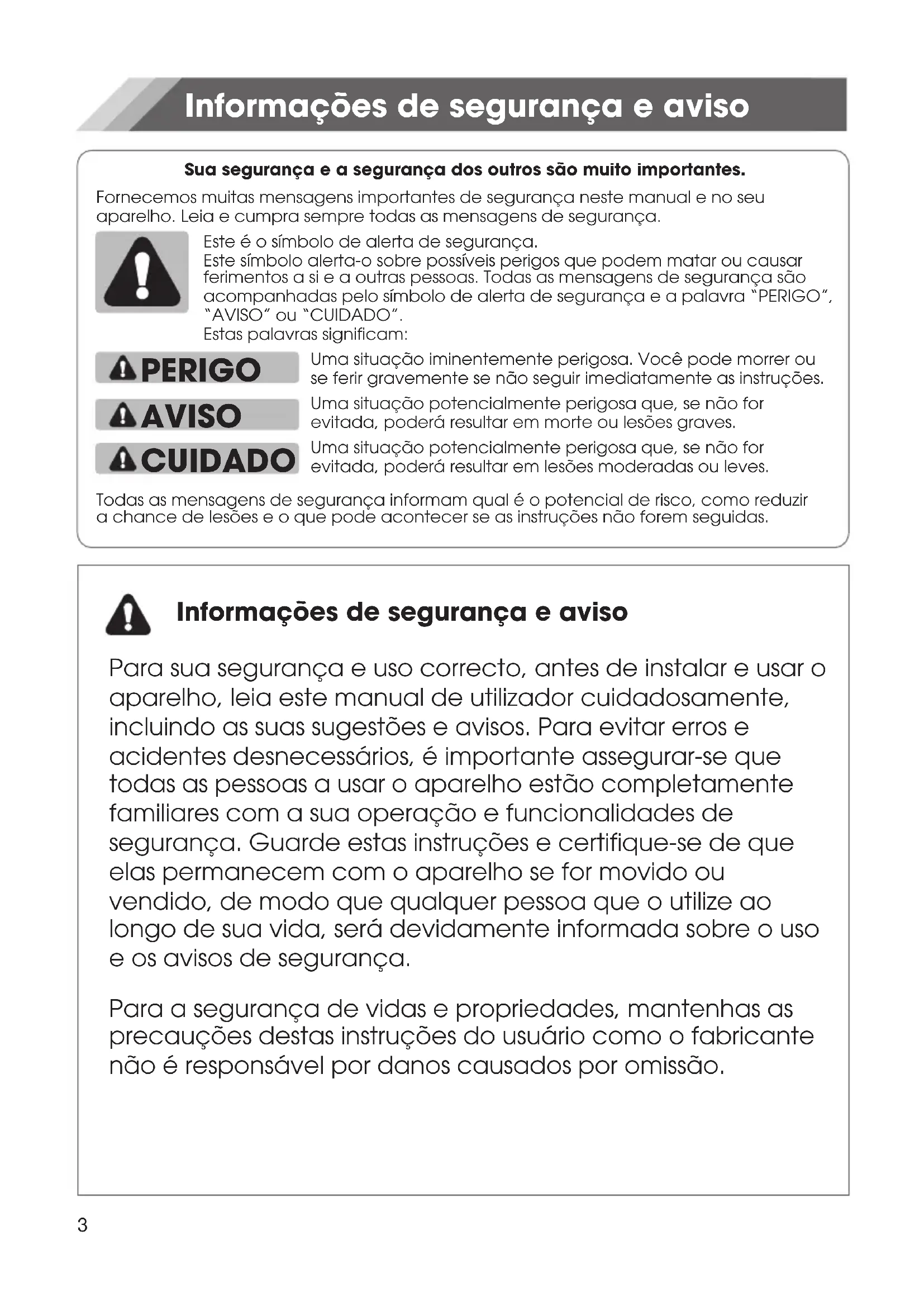 2Sua segurança e a segurança dos outros são muito importantes. PERIGO AVISO CUIDADO Informações de segurança e aviso Informações de segurança e aviso Para sua segurança e uso correcto, antes de instalar e usar o aparelho, leia este manual de utilizador cuidadosamente, incluindo as suas sugestões e avisos. Para evitar erros e acidentes desnecessários, é importante assegurar-se que todas as pessoas a usar o aparelho estão completamente familiares com a sua operação e funcionalidades de segurança. Guarde estas instruções e certifique-se de que elas permanecem com o aparelho se for movido ou vendido, de modo que qualquer pessoa que o utilize ao longo de sua vida, será devidamente informada sobre o uso e os avisos de segurança. Para a segurança de vidas e propriedades, mantenhas as precauções destas instruções do usuário como o fabricante não é responsável por danos causados por omissão. Fornecemos muitas mensagens importantes de segurança neste manual e no seu aparelho. Leia e cumpra sempre todas as mensagens de segurança. Este é o símbolo de alerta de segurança. Este símbolo alerta-o sobre possíveis perigos que podem matar ou causar ferimentos a si e a outras pessoas. Todas as mensagens de segurança são acompanhadas pelo símbolo de alerta de segurança e a palavra “PERIGO”, “AVISO” ou “CUIDADO”. Estas palavras significam: Uma situação iminentemente perigosa. Você pode morrer ou se ferir gravemente se não seguir imediatamente as instruções. Uma situação potencialmente perigosa que, se não for evitada, poderá resultar em morte ou lesões graves. Uma situação potencialmente perigosa que, se não for evitada, poderá resultar em lesões moderadas ou leves. Todas as mensagens de segurança informam qual é o potencial de risco, como reduzir a chance de lesões e o que pode acontecer se as instruções não forem seguidas. 3Segurança para crianças e outras pessoas vulneráveis De acordo com o padrão EN Este aparelho pode ser utilizado por crianças com idade igual ou superior a 8 anos e pessoas com capacidades físicas, sensoriais ou mentais reduzidas ou falta de experiência e conhecimento, se tiverem recebido supervisão ou instruções relativas ao uso do aparelho de forma segura e que tenham compreensão dos riscos envolvidos. As crianças não devem brincar com o aparelho. A limpeza e a manutenção do utilizador não devem ser feitas por crianças sem supervisão. Crianças com idade entre 3 e 8 anos podem carregar e descarregar aparelhos de refrigeração. De acordo com o padrão IEC Este aparelho não está destinado a ser usado por pessoas (incluindo crianças) com capacidades físicas, sensoriais ou mentais reduzidas ou falta de experiência e conhecimento, a não ser que tenham supervisão ou instruções relativas ao uso deste aparelho por uma pessoa responsável pela sua segurança. Crianças devem ser supervisionadas para garantir que não brinquem com o aparelho. Mantenha todas as embalagens fora do alcance das crianças porque há o risco de asfixia. Se for eliminar o aparelho, puxe a ficha para fora da tomada, corte o cabo de conexão (tão perto do aparelho quanto possível) e remova a porta para prevenir que crianças a brincar sofram de choques eléctricos ou se fechem dentro. Se este aparelho, com selos de porta magnética, é para substituir um aparelho antigo com fechos de mola (trava) na porta ou tampa, assegure-se que os fechos de mola são inutilizáveis antes de eliminar o aparelho antigo. Isto irá prevenir que o aparelho se torne uma armadilha fatal para uma criança. 4Segurança geral AVISO — Este aparelho destina-se a ser utilizado em aplicações domésticas e similares, tais como -áreas de cozinha em lojas, escritórios e outros ambientes de trabalho; -casas de quintas e por clientes em hotéis, motéis e outros ambientes de tipo residencial; -ambientes do tipo de cama e café da manhã; -restauração e aplicações similares não varejistas. AVISO — Não guarde substâncias explosivas tais como latas de aerossol com um propulsor inflamável no aparelho. AVISO — Se o cabo de alimentação estiver danificado, ele deve ser substituído pelo fabricante, agente de assistência ou técnico qualificado, a fim de evitar situações de risco. AVISO — Mantenha a ventilação aberta, no gabinete do aparelho ou na estrutura incorporada, sem obstrução. AVISO — Não utilize dispositivos mecânicos ou outros meios para acelerar o processo de descongelação, exceto os recomendados pelo fabricante. AVISO — Não danifique o circuito de refrigeração. AVISO — Não utilize aparelhos eléctricos no interior dos compartimentos de armazenamento de alimentos do aparelho, a menos que sejam do tipo recomendado pelo fabricante. AVISO — O refrigerante e o gás de sopro de isolamento são inflamáveis. Ao descartar o aparelho, faça a eliminação apenas num centro de eliminação de resíduos autorizada. Não exponha-o ao fogo. AVISO — Ao posicionar o aparelho, assegure-se que o cabo de alimentação não está preso ou danificado. 5AVISO — Não coloque várias saídas de tomada portátil ou fontes de energia portáteis atrás do aparelho. AVISO — O alimento precisa ser embalado antes de ser colocado na geladeira, e os líquidos precisam ser acondicionados em garrafas ou recipientes para permitir uma limpeza correta do produto. O símbolo é um aviso e indica que o refrigerante e o gás de isolamento são inflamáveis. Aviso: Risco de incêndio / materiais inflamáveis Substituir as lâmpadas de iluminação AVISO — As lâmpadas não devem ser substituídas pelo utilizador! Se as lâmpadas estiverem danificadas, contacte a linha de apoio ao cliente para assistência. Este aviso é apenas para refrigeradores com lâmpadas. Refrigerante O refrigerante isobuteno (R600a) está contido no circuito refrigerante do aparelho, um gás natural com um alto nível de compatibilidade ambiental, que é, no e