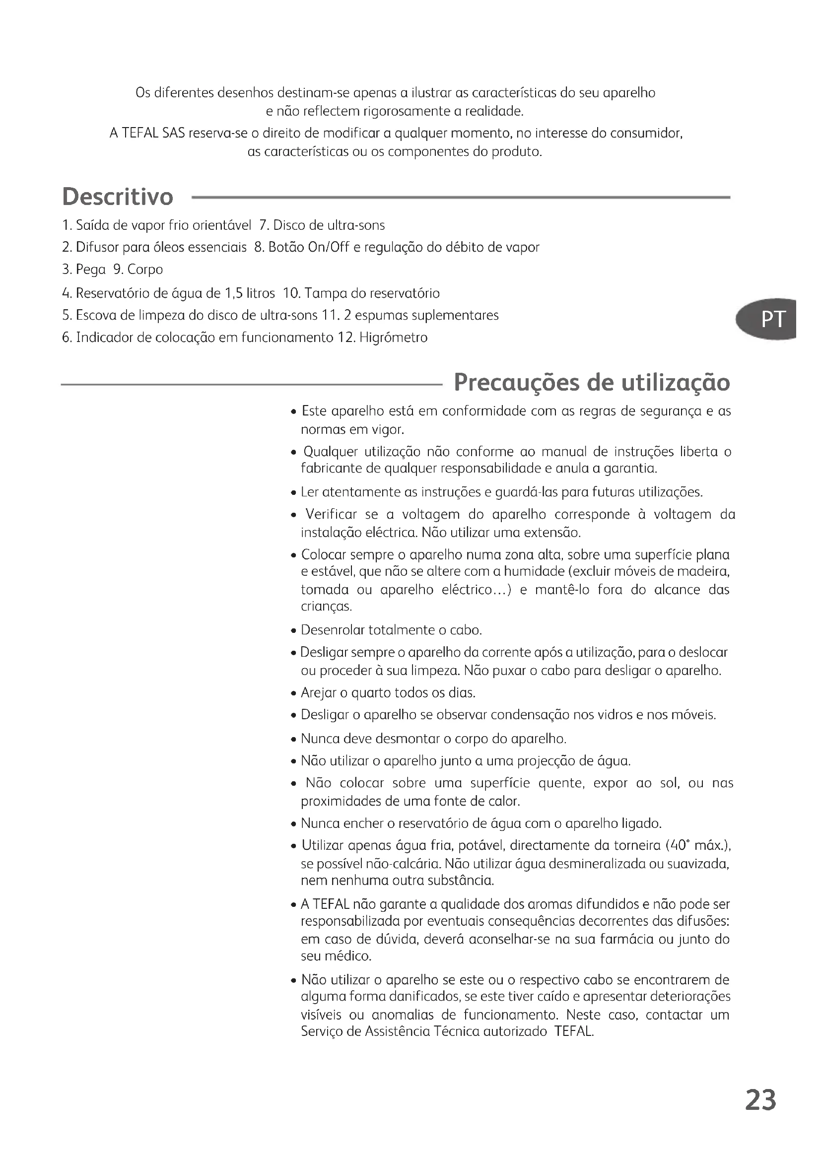 - A TEFAL não garante a qualidade dos aromas difundidos e não pode ser responsabilizada por eventuais consequências decorrentes das difusões: em caso de dúvida, deverá aconselhar-se na sua farmácia ou junto do seu médico.