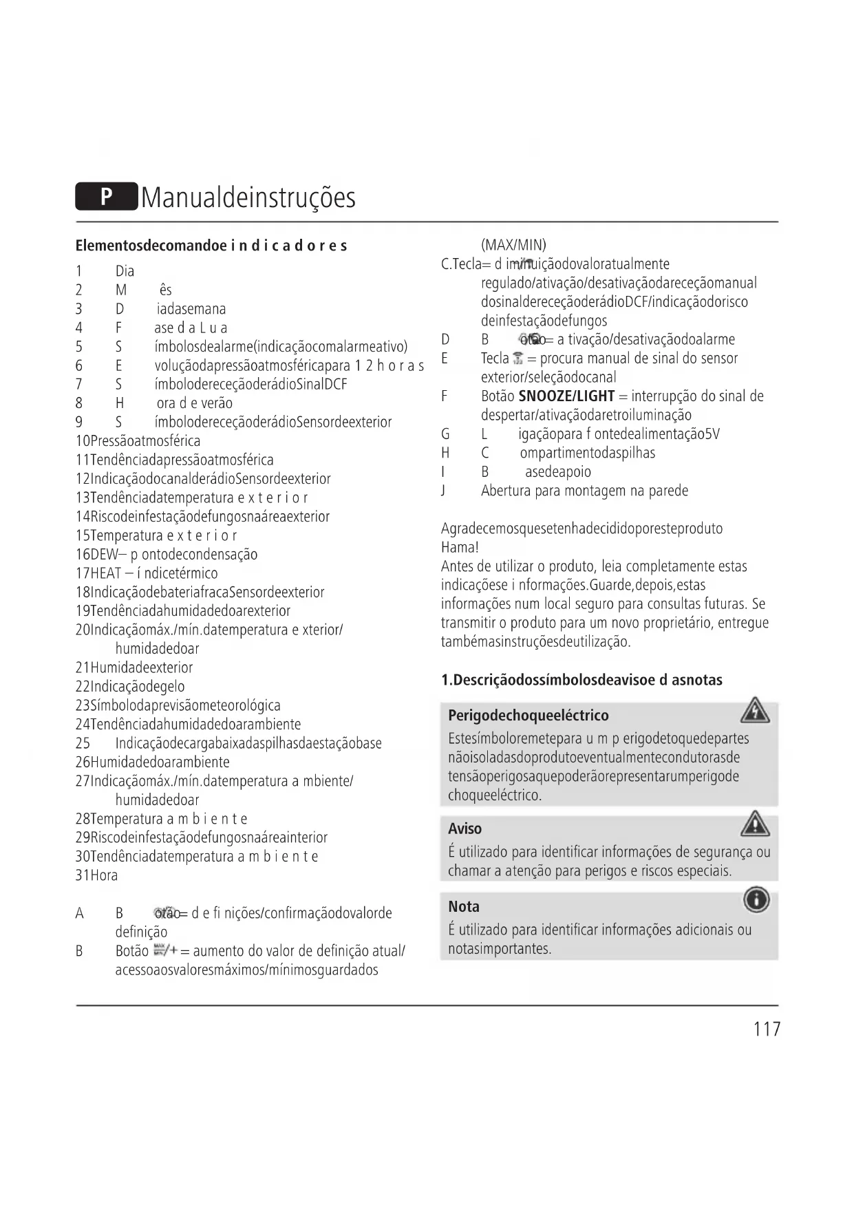 Indicação de carga baixa das pilhas da estação base 26 Humidade do ar ambiente 27 Indicação máx./mín. da temperaturaambiente/ humidade do ar 28 Temperaturaambiente 29 Risco de infestação de fungos na área interior 30 Tendência da temperaturaambiente 31 Hora ABotão =denições/conrmação do valor de denição BBotão =aumento do valor de denição atual/ acesso aos valores máximos/mínimos guardados (MAX/MIN) C. Tecla =diminuição do valor atualmente regulado/ativação/desativação da receção manual do sinal de receção de rádio DCF/indicação do risco de infestação de fungos DBotão =ativação/desativação do alarme ETecla =procuramanual de sinal do sensor exterior/seleção do canal FBotão SNOOZE/LIGHT =interrupção do sinal de despertar/ativação da retroiluminação GLigação parafonte de alimentação 5V HCompartimento das pilhas IBase de apoio JAberturaparamontagem na parede Agradecemos que se tenha decidido por este produto Hama! Antes de utilizar oproduto, leia completamente estas indicações einformações. Guarde, depois, estas informações num local seguroparaconsultas futuras. Se transmitir oproduto paraumnovo proprietário, entregue também as instruções de utilização.