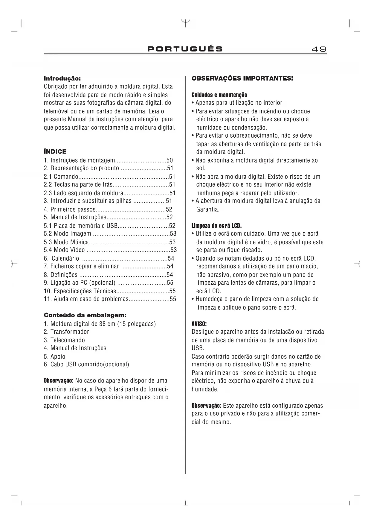 Introdução: Obrigado por ter adquirido a moldura digital. Esta foi desenvolvida para de modo rápido e simples mostrar as suas fotografias da câmara digital, do telemóvel ou de um cartão de memória. Leia o presente Manual de instruções com atenção, para que possa utilizar correctamente a moldura digital. ÍNDICE