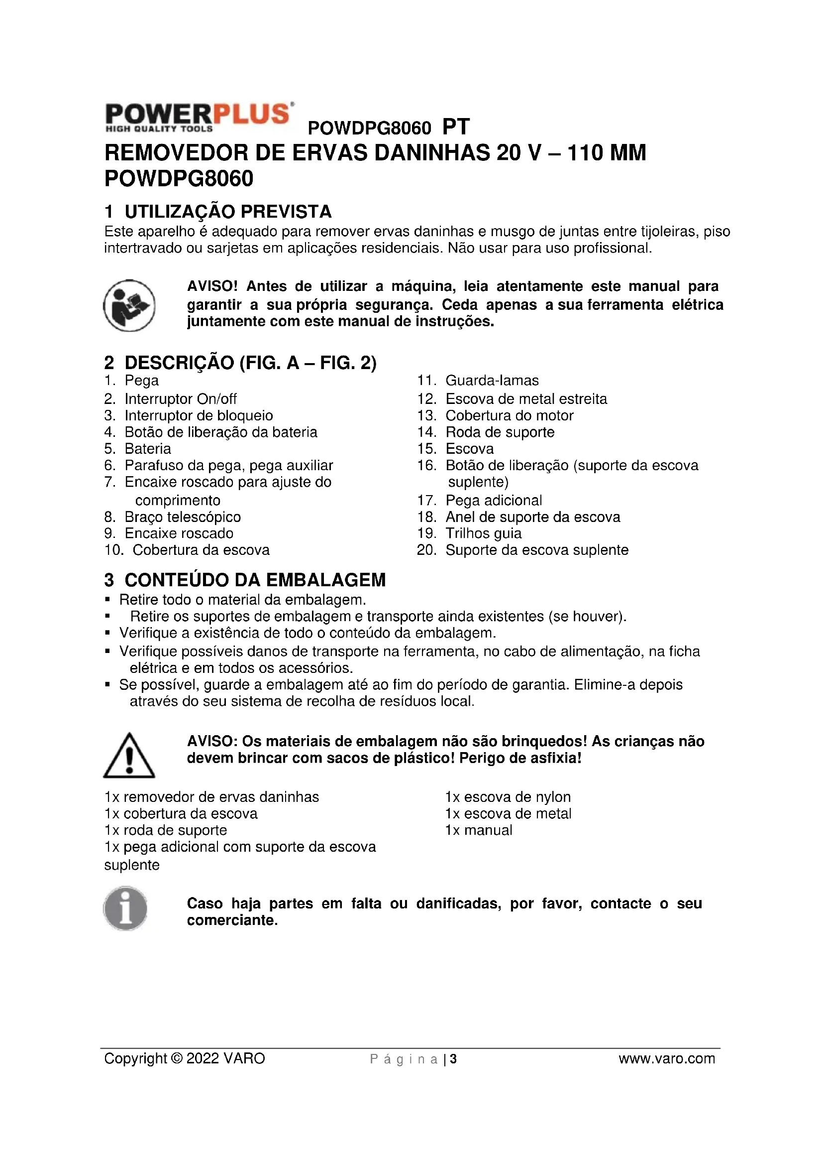 VARO – Vic. Van Rompuy N.V. – Joseph Van Instraat 9 – BE2500 Lier – Bélgica, declara que, Designação do aparelho: Removedor de ervas daninhas – operado a bateria Marca: PowerPlus Modelo nº.: POWDPG8060 se encontra em conformidade com os requisitos essenciais e outras provisões relevantes das Diretivas Comunitárias aplicáveis, com base na aplicação das normas Europeias harmonizadas. Qualquer alteração não autorizada do equipamento anula esta declaração. Diretivas Europeias (incluindo, se aplicável, as respetivas emendas até à data de assinatura): 2011/65/EU 2006/42/EC 2014/30/EU 2000/14/EC Anexa VI LwA Measured 84 dB(A) Guaranteed 86 dB(A) Normas Europeias harmonizadas (incluindo, se aplicável, as respetivas emendas até à data de assinatura): EN62841-1 : 2015 EN55014-1 : 2017 EN55014-2 : 2015 Detentor da Documentação Técnica: Philippe Vankerkhove, VARO – Vic. Van Rompuy N.V. O signatário atua em nome da administração da empresa, Ludo Mertens Assuntos Regulamentares – Gestor de Conformidade 15/03/2021, Lier - BelgiumPOWDPG8060 NO Copyright © 2022 VARO S i d e | 1 www.varo.com 1 TILTENKT BRUK ............................................................................. 3