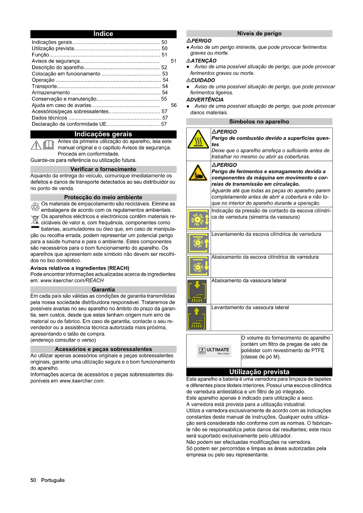 - dB(A) 2 Chairman of the Board of Management Director Regulatory Affairs & Certification H. Jenner S. Reiser50 Português Índice Indicações gerais Antes da primeira utilização do aparelho, leia este manual original e o capítulo Avisos de segurança. Proceda em conformidade. Guarde-os para referência ou utilização futura. Verificar o fornecimento Aquando da entrega do veículo, comunique imediatamente os defeitos e danos de transporte detectados ao seu distribuidor ou no ponto de venda. Protecção do meio ambiente Os materiais de empacotamento são recicláveis. Elimine as embalagens de acordo com os regulamentos ambientais. Os aparelhos eléctricos e electrónicos contêm materiais re- cicláveis de valor e, com frequência, componentes como baterias, acumuladores ou óleo que, em caso de manipula- ção ou recolha errada, podem representar um potencial perigo para a saúde humana e para o ambiente. Estes componentes são necessários para o bom funcionamento do aparelho. Os aparelhos que apresentem este símbolo não devem ser recolhi- dos no lixo doméstico. Avisos relativos a ingredientes (REACH) Pode encontrar informações actualizadas acerca de ingredientes em: www.kaercher.com/REACH Garantia Em cada país são válidas as condições de garantia transmitidas pela nossa sociedade distribuidora responsável. Trataremos de possíveis avarias no seu aparelho no âmbito do prazo da garan- tia, sem custos, desde que estas tenham origem num erro de material ou de fabrico. Em caso de garantia, contacte o seu re- vendedor ou a assistência técnica autorizada mais próxima, apresentando o talão de compra. (endereço consultar o verso) Acessórios e peças sobressalentes Ao utilizar apenas acessórios originais e peças sobressalentes originais, garante uma utilização segura e o bom funcionamento do aparelho. Informações acerca de acessórios e peças sobressalentes dis- poníveis em www.kaercher.com. Níveis de perigo PERIGO ● Aviso de um perigo iminente, que pode provocar ferimentos graves ou morte. 몇 ATENÇÃO ● Aviso de uma possível situação de perigo, que pode provocar ferimentos graves ou morte. 몇 CUIDADO ● Aviso de uma possível situação de perigo, que pode provocar ferimentos ligeiros. ADVERTÊNCIA ● Aviso de uma possível situação de perigo, que pode provocar danos materiais. Símbolos no aparelho Utilização prevista Este aparelho a bateria é uma varredora para limpeza de tapetes e diferentes pisos têxteis interiores. Possui uma escova cilíndrica de varredura antiestática e um filtro de pó integrado. Este aparelho apenas é indicado para utilização a seco. A varredora está prevista para a utilização industrial. Utilize a varredora exclusivamente de acordo com as indicações constantes deste manual de instruções. Qualquer outra utiliza- ção será considerada não conforme com as normas. O fabrican- te não se responsabiliza pelos danos daí resultantes; este risco será suportado exclusivamente pelo utilizador. Não podem ser efectuadas modificações na varredora. Só podem ser percorridas e limpas as áreas autorizadas pela empresa ou pelo seu representante. Indicações gerais p. 50