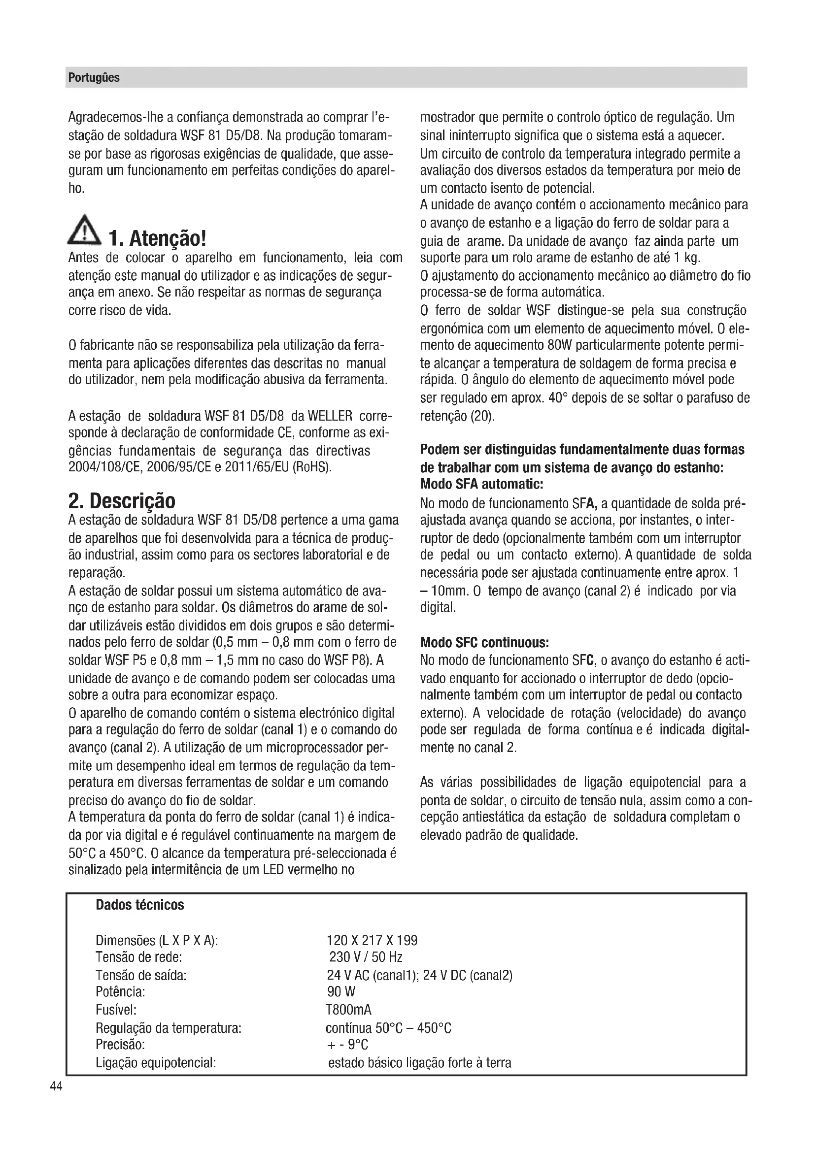 Portugûes Dados técnicos Dimensões (L X P X A): 120 X 217 X 199 Tensão de rede: 230 V / 50 Hz Tensão de saída: 24 V AC (canal1); 24 V DC (canal2) Potência: 90 W Fusível: T800mA Regulação da temperatura: contínua 50°C – 450°C Precisão: + - 9°C Ligação equipotencial: estado básico ligação forte à terra45