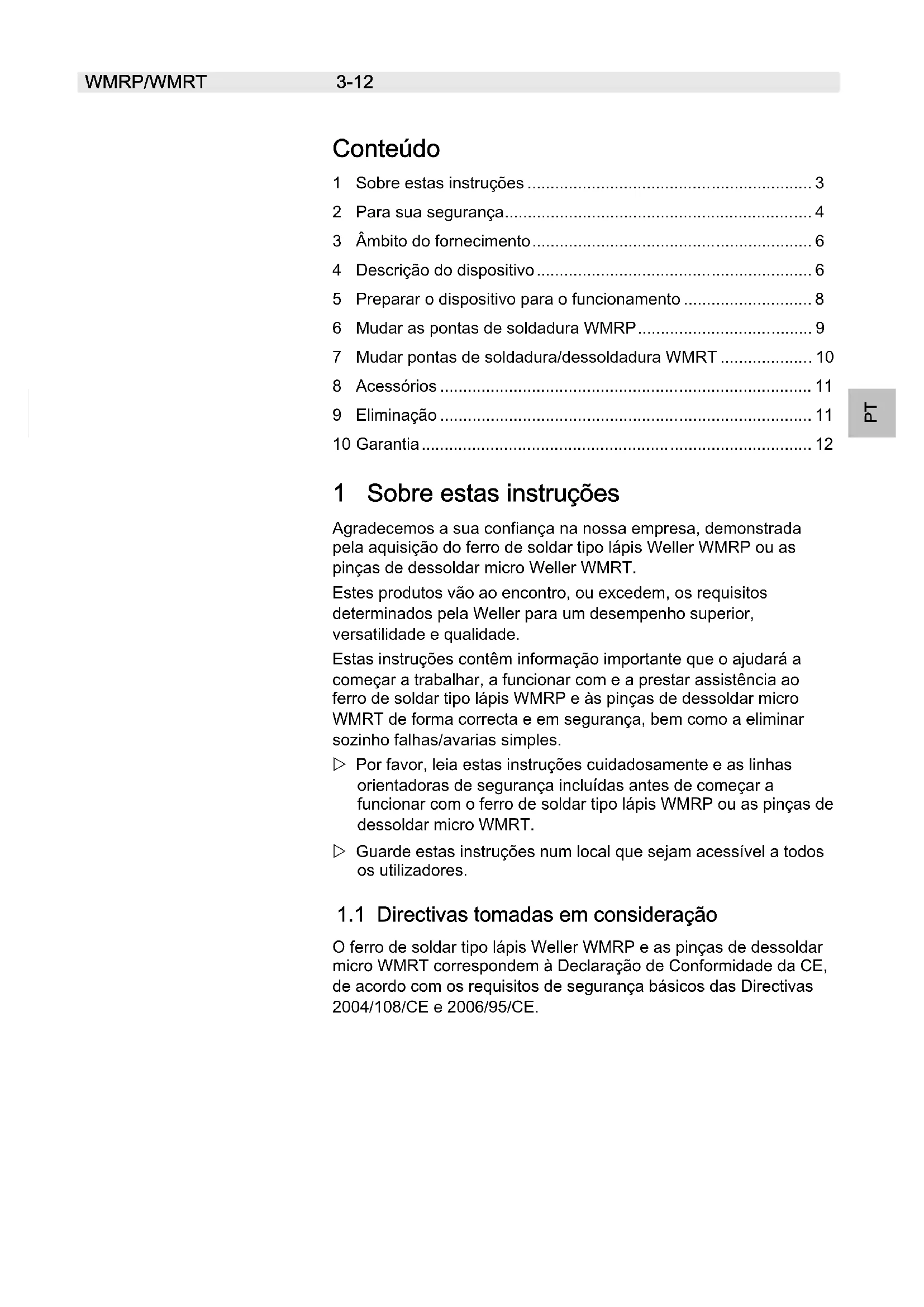 - 10Garantia 1 Sobre estas instruções Agradecemos a sua confiança na nossa empresa, demonstrada pela aquisição do ferro de soldar tipo lápis Weller WMRP ou as pinças de dessoldar micro Weller WMRT. Estes produtos vão ao encontro, ou excedem, os requisitos determinados pela Weller para um desempenho superior, versatilidade e qualidade. Estas instruções contêm informação importante que o ajudará a começar a trabalhar, a funcionar com e a prestar assistência ao ferro de soldar tipo lápis WMRP e às pinças de dessoldar micro WMRT de forma correcta e em segurança, bem como a eliminar sozinho falhas/avarias simples. Por favor, leia estas instruções cuidadosamente e as linhas orientadoras de segurança incluídas antes de começar a funcionar com o ferro de soldar tipo lápis WMRP ou as pinças de dessoldar micro WMRT. Guarde estas instruções num local que sejam acessível a todos os utilizadores. p. 12