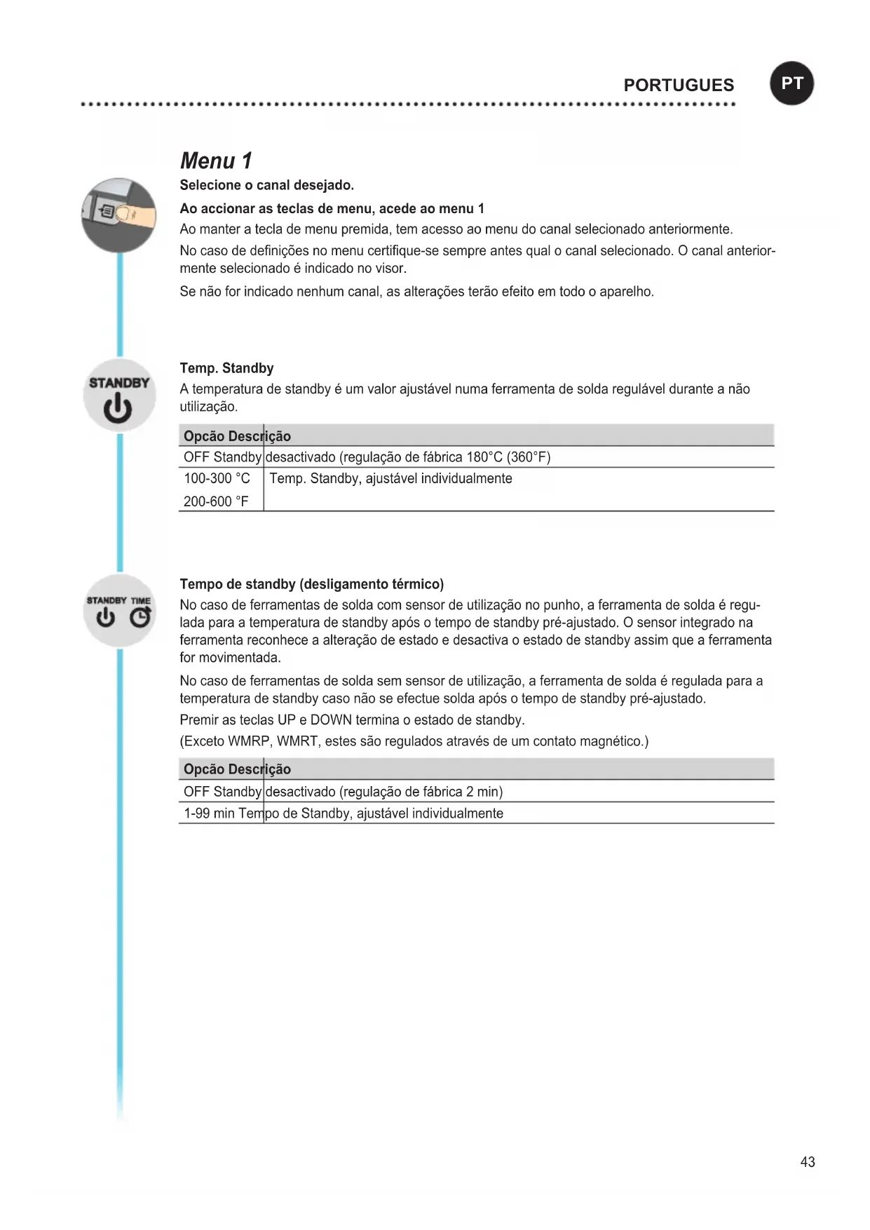- Controllare le impostazioni dell‘interfaccia43 Menu 1 Selecione o canal desejado. Ao accionar as teclas de menu, acede ao menu 1 Ao manter a tecla de menu premida, tem acesso ao menu do canal selecionado anteriormente. No caso de denições no menu certique-se sempre antes qual o canal selecionado. O canal anterior- mente selecionado é indicado no visor. Se não for indicado nenhum canal, as alterações terão efeito em todo o aparelho. Temp. Standby A temperatura de standby é um valor ajustável numa ferramenta de solda regulável durante a não utilização. Opcão Descrição OFF Standby desactivado (regulação de fábrica 180°C (360°F) 100-300 °C 200-600 °F Temp. Standby, ajustável individualmente Tempo de standby (desligamento térmico) No caso de ferramentas de solda com sensor de utilização no punho, a ferramenta de solda é regu- lada para a temperatura de standby após o tempo de standby pré-ajustado. O sensor integrado na ferramenta reconhece a alteração de estado e desactiva o estado de standby assim que a ferramenta for movimentada. No caso de ferramentas de solda sem sensor de utilização, a ferramenta de solda é regulada para a temperatura de standby caso não se efectue solda após o tempo de standby pré-ajustado. Premir as teclas UP e DOWN termina o estado de standby. (Exceto WMRP, WMRT, estes são regulados através de um contato magnético.) Opcão Descrição OFF Standby desactivado (regulação de fábrica 2 min) 1-99 min Tempo de Standby, ajustável individualmente