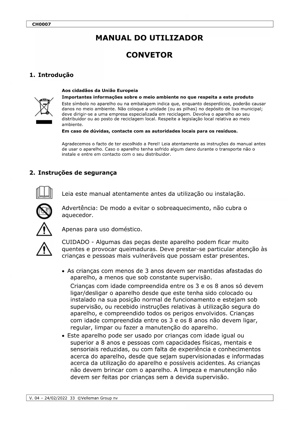 Utilize este aparelho apenas com acessórios originais. A Velleman Group nv não será responsável por quaisquer danos ou lesões causados pelo uso (indevido) do aparelho. Para mais informação sobre este produto e para aceder à versão mais recente deste manual do utilizador, visite a nossa página www.velleman.eu. Podem alterar-se as especificações e o conteúdo deste manual sem aviso prévio.