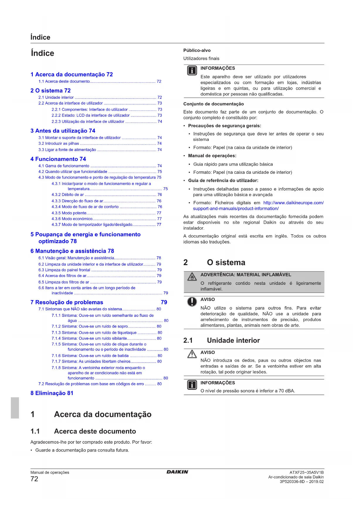 Ar-condicionado de sala Daikin 3P520336-8D – 2019.02 Índice 1 Acerca da documentação 72