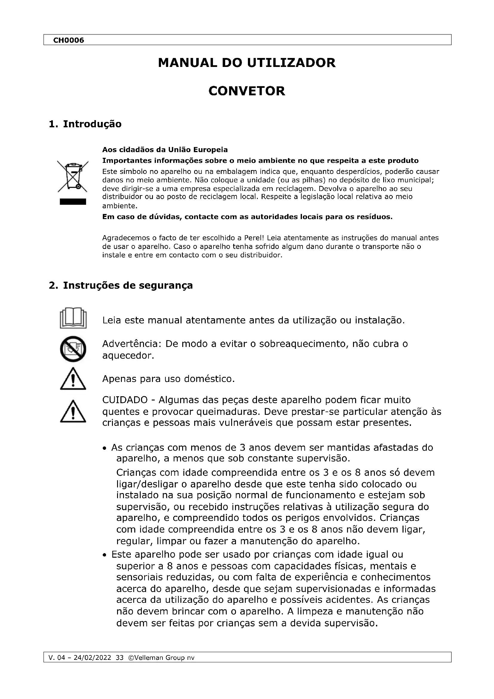Utilize este aparelho apenas com acessórios originais. A Velleman Group nv não será responsável por quaisquer danos ou lesões causados pelo uso (indevido) do aparelho. Para mais informação sobre este produto e para aceder à versão mais recente deste manual do utilizador, visite a nossa página www.velleman.eu. Podem alterar-se as especificações e o conteúdo deste manual sem aviso prévio.