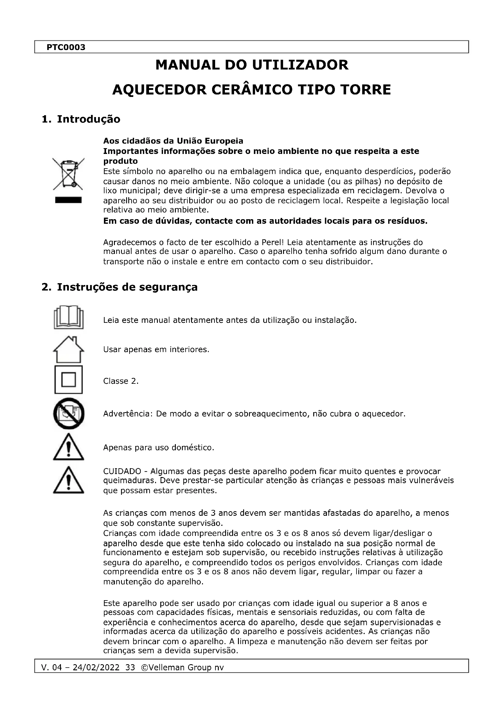 Este aparelho pode ser usado por crianças com idade igual ou superior a 8 anos e pessoas com capacidades físicas, mentais e sensoriais reduzidas, ou com falta de experiência e conhecimentos acerca do aparelho, desde que sejam supervisionadas e informadas acerca da utilização do aparelho e possíveis acidentes. As crianças não devem brincar com o aparelho. A limpeza e manutenção não devem ser feitas por crianças sem a devida supervisão.PTC0003