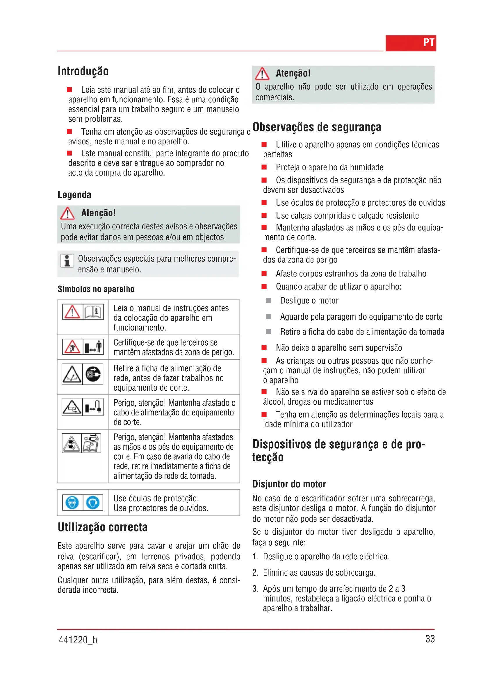 Introdução Leia este manual até ao fim, antes de colocar o aparelho em funcionamento. Essa é uma condição essencial para um trabalho seguro e um manuseio sem problemas. Tenha em atenção as observações de segurança e avisos, neste manual e no aparelho. Este manual constitui parte integrante do produto descrito e deve ser entregue ao comprador no acto da compra do aparelho. Legenda Atenção! Uma execução correcta destes avisos e observações pode evitar danos em pessoas e/ou em objectos. Observações especiais para melhores compre- ensão e manuseio. Simbolos no aparelho Leia o manual de instruções antes da colocação do aparelho em funcionamento. Certifique-se de que terceiros se mantêm afastados da zona de perigo. Retire a ficha de alimentação de rede, antes de fazer trabalhos no equipamento de corte. Perigo, atenção! Mantenha afastado o cabo de alimentação do equipamento de corte. Perigo, atenção! Mantenha afastados as mãos e os pés do equipamento de corte. Em caso de avaria do cabo de rede, retire imediatamente a ficha de alimentação de rede da tomada. Use óculos de protecção. Use protectores de ouvidos. Utilização correcta Este aparelho serve para cavar e arejar um chão de relva (escarificar), em terrenos privados, podendo apenas ser utilizado em relva seca e cortada curta. Qualquer outra utilização, para além destas, é consi- derada incorrecta. Atenção! O aparelho não pode ser utilizado em operações comerciais. Observações de segurança Utilize o aparelho apenas em condições técnicas perfeitas Proteja o aparelho da humidade Os dispositivos de segurança e de protecção não devem ser desactivados Use óculos de protecção e protectores de ouvidos Use calças compridas e calçado resistente Mantenha afastados as mãos e os pés do equipa- mento de corte. Certifique-se de que terceiros se mantêm afasta- dos da zona de perigo Afaste corpos estranhos da zona de trabalho Quando acabar de utilizar o aparelho: Desligue o motor Aguarde pela paragem do equipamento de corte Retire a ficha do cabo de alimentação da tomada Não deixe o aparelho sem supervisão As crianças ou outras pessoas que não conhe- çam o manual de instruções, não podem utilizar o aparelho Não se sirva do aparelho se estiver sob o efeito de álcool, drogas ou medicamentos Tenha em atenção as determinações locais para a idade mínima do utilizador Dispositivos de segurança e de pro- tecção Disjuntor do motor No caso de o escarificador sofrer uma sobrecarrega, este disjuntor desliga o motor. A função do disjuntor do motor não pode ser desactivada. Se o disjuntor do motor tiver desligado o aparelho, faça o seguinte: