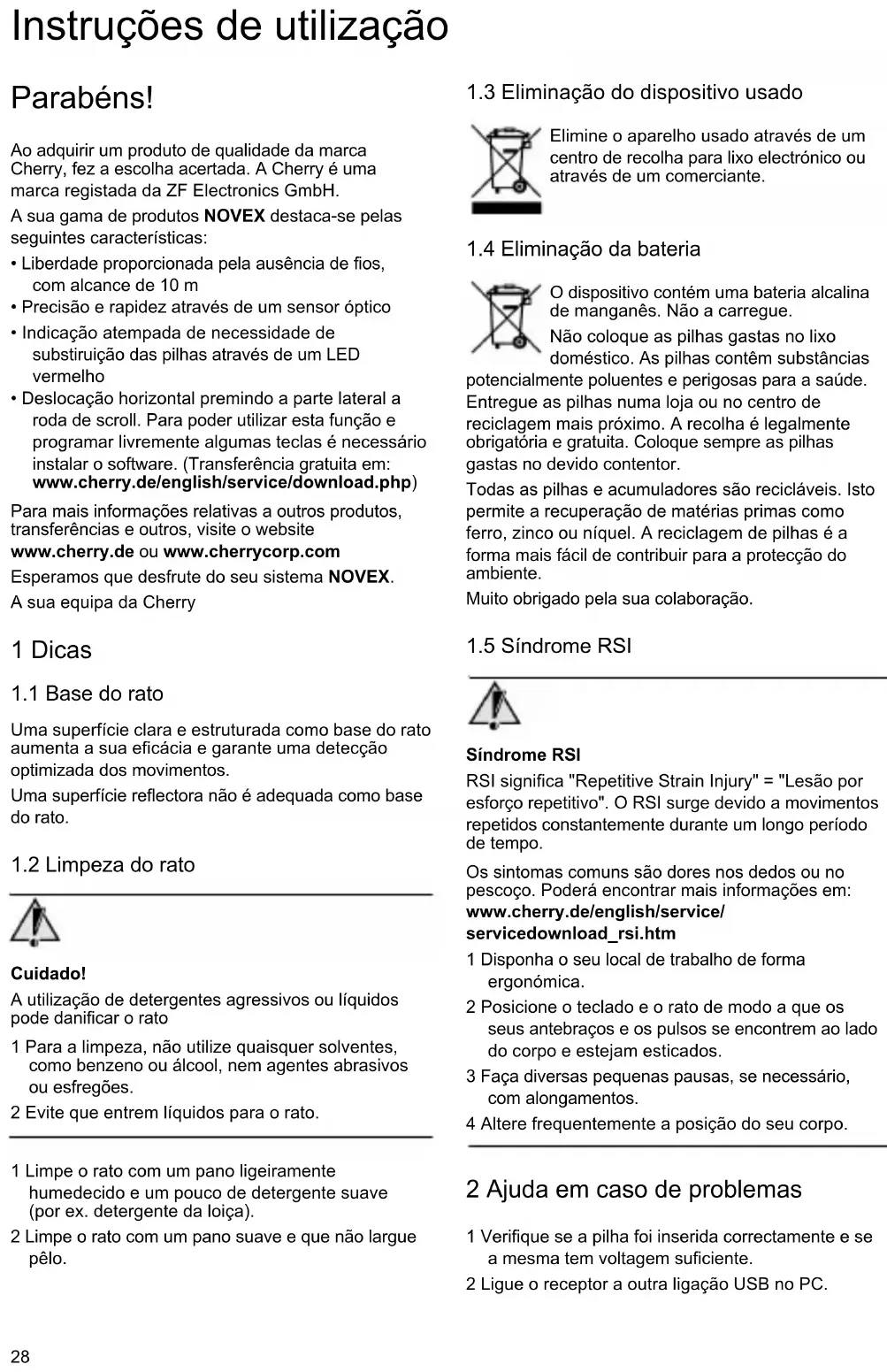 - Sistema operativo e, se necessário, versão instalada de um service pack 5 Indicação geral para o utilizador A Cherry, uma marca da ZF Electronics GmbH, optimiza constantemente os seus produtos no sentido do desenvolvimento de novas tecnologias. Por isso, reservamo-nos o direito a alterações técnicas. A determinação da fiabilidade, assim como a definição de dados técnicos são efectuadas em conformidade com uma verificação interna, de modo a cumprir os regulamentos ou normas reconhecidos internacionalmente. Outros requisitos poderão ser cumpridos através de uma cooperação mútua. O manuseamento e o armazenamento incorrectos, assim como influências externas podem provocar avarias e danos durante o funcionamento. Designação Valor Tensão de alimentação Rato: 0,75 ... 1,5 V SELV Receptor: 5,0 V/DC ±5 % SELV Consumo de energia Rato: máx. 25 mA Receptor: máx. 30 mA Pilha do rato 1 pilha alcalina de manganês, tipo LR6 (AA) Temperatura de armazenamento –20 °C ... +60 °C Temperatura operacional 0 °C ... +40 °C Não oferecemos qualquer garantia para anomalias resultantes da alteração do produto por parte do utilizador e não nos responsabilizamos por alterações não autorizadas. Todas as reparações devem ser realizadas por nós ou por uma pessoa ou organização com autorização oficial. Quaisquer pedidos de indemnização à ZF Electronics GmbH ou aos seus representantes nomeados – independentemente da base legal (incluindo lesões corporais relacionadas com o stress) – estão excluídos, desde que não nos seja apontada premeditação, negligência grosseira ou a inobservância dos regulamentos obrigatórios de garantia de produtos ou em caso de danos para a vida, corpo e saúde. As presentes instruções são apenas válidas para o produto fornecido. Mais informações sobre isto estão disponíveis junto dos respectivos distribuidores ou directamente connosco. 6 Indicações de perigo Perigo de asfixia através da ingestão de peças pequenas ¾ Mantenha o aparelho longe do alcance de crianças com idade inferior a 6 anos. 7 Declaração de conformidade CE A ZF Electronics GmbH, Auerbach/Opf., Alemanha, declara, por este meio, que este aparelho periférico com função rádio se encontra em conformidade com os requisitos básicos e as restantes disposições aplicáveis da directiva 1999/5/CE. Poderá encontrar a declaração de conformidade CE no seguinte endereço de Internet: http://www.cherry.de/compliance Clique no nome do produto para abrir a declaração de conformidade CE.30 Garantia limitada do fabricante Garantia limitada – garantia legal: Tenha em atenção que a garantia limitada do fabricante apresentada em seguida tem validade em simultâneo com os seus direitos legais e devidos de garantia, não os substituindo ou limitando. Para a reivindicação dos seus direitos legais de garantia sobre a venda de bens de consumo, entre em contacto com o vendedor deste produto.