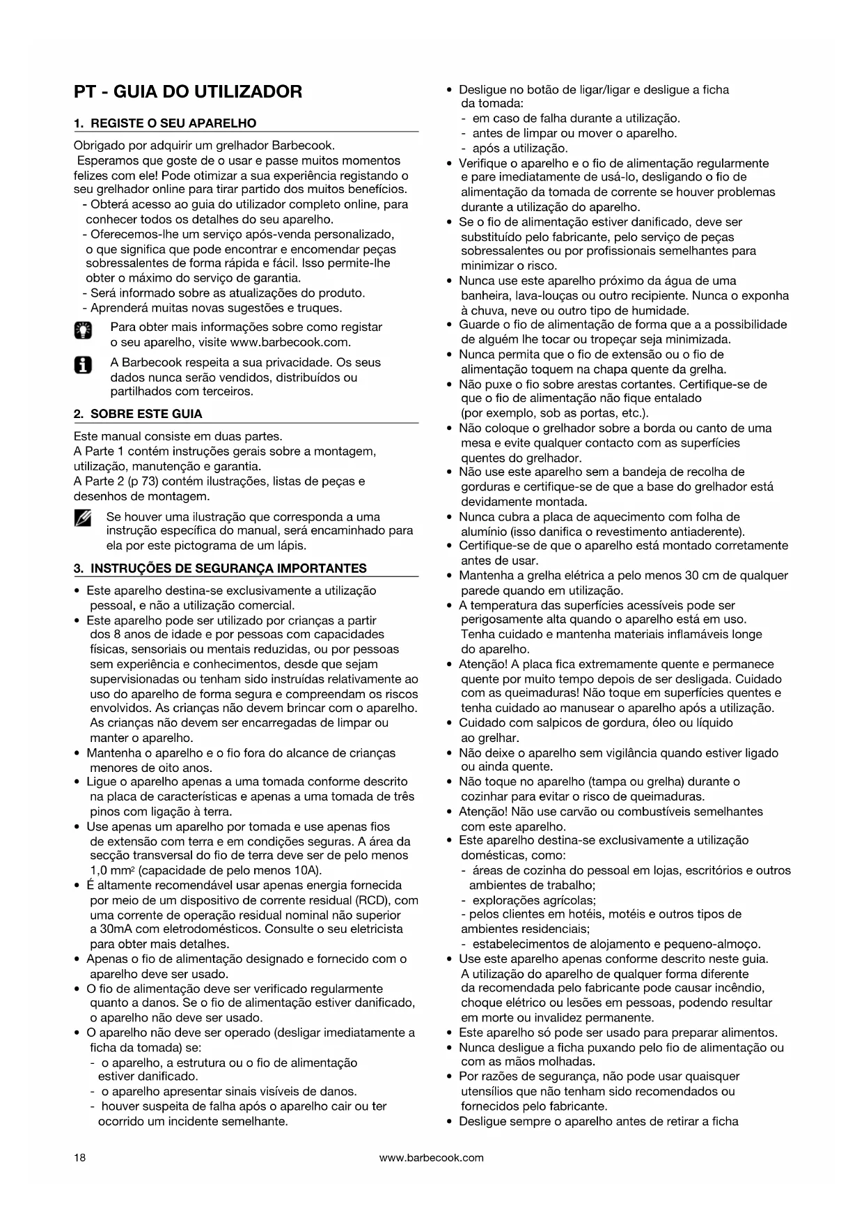 Obrigado por adquirir um grelhador Barbecook. Esperamos que goste de o usar e passe muitos momentos felizes com ele! Pode otimizar a sua experiência registando o seu grelhador online para tirar partido dos muitos benefícios. - Obterá acesso ao guia do utilizador completo online, para conhecer todos os detalhes do seu aparelho. - Oferecemos-lhe um serviço após-venda personalizado, o que signica que pode encontrar e encomendar peças sobressalentes de forma rápida e fácil. Isso permite-lhe obter o máximo do serviço de garantia. - Será informado sobre as atualizações do produto. - Aprenderá muitas novas sugestões e truques. Para obter mais informações sobre como registar o seu aparelho, visite www.barbecook.com. A Barbecook respeita a sua privacidade. Os seus dados nunca serão vendidos, distribuídos ou partilhados com terceiros.