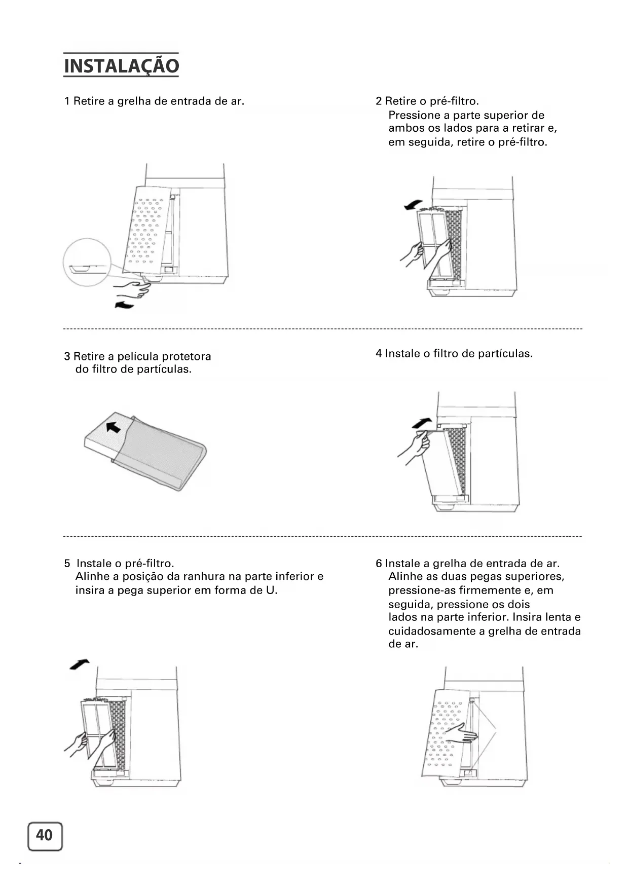 DESCRIÇÃO40 INSTALAÇÃO 1 Retire a grelha de entrada de ar. 3 Retire a película protetora do ltro de partículas. 5 Instale o pré-ltro. Alinhe a posição da ranhura na parte inferior e insira a pega superior em forma de U. 6 Instale a grelha de entrada de ar. Alinhe as duas pegas superiores, pressione-as rmemente e, em seguida, pressione os dois lados na parte inferior. Insira lenta e cuidadosamente a grelha de entrada de ar. 4 Instale o ltro de partículas. 2 Retire o pré-ltro. Pressione a parte superior de ambos os lados para a retirar e, em seguida, retire o pré-ltro.PT