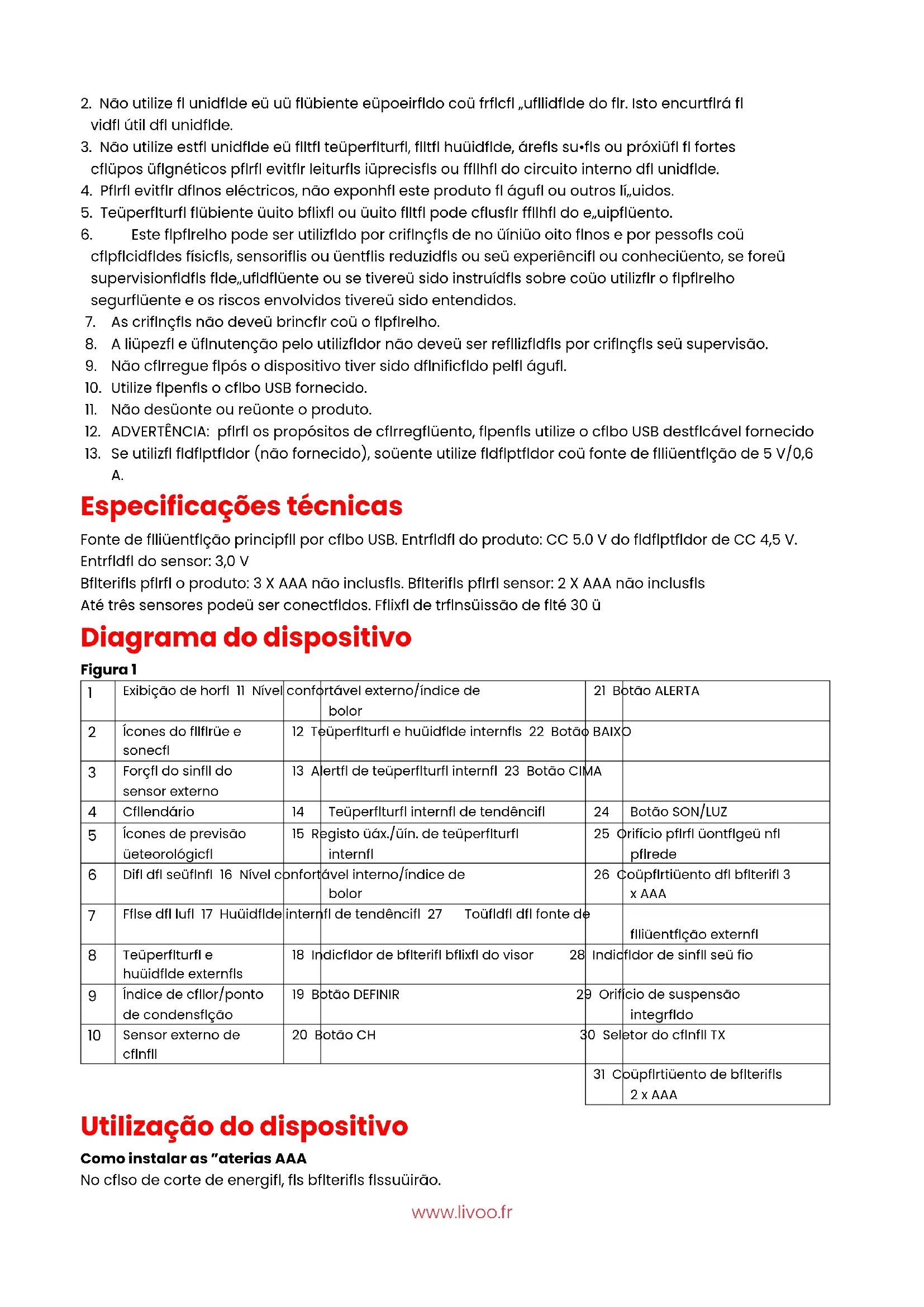 Utilização do dispositivo Como instalar as baterias AAA No caso de corte de energia, as baterias assumirão.www.livoo.fr No caso de corte de energia, as baterias assumirão. Abra o compartimento da bateria do produto. Insira 3 baterias AAA, combinando a polaridade correta. Feche o compartimento. Abra o compartimento da bateria do sensor. Insira 2 baterias AAA, combinando as polaridades. Feche o compartimento Nunca misture baterias velhas com novas. Não misture baterias alcalinas, padrão e/ou recarregáveis. Nota: quando a unidade do visor é ligada apenas pela bateria, a luz traseira apagará para preservar a bateria. Premir o botão SON/LIGHT para ativar a luz traseira por dez segundos. Colocação da unidade do visor Coloque a unidade do visor em uma área seca livre de sujeira e poeira. A unidade do visor permanece em uma superfície plana e estável. Orientações importantes para posicionamento Para assegurar uma medição de temperatura precisa, coloque as unidades fora da luz solar direta e distante de quaisquer fontes de calor ou ventilações. A unidade do visor e o sensor externo deve estar dentro de 30 m (99 pés) um do outro. Para maximizar o alcance sem fio, coloque as unidades distantes de grandes itens metálicos, muros espessos, superfícies metálicas ou outros objetos que possam limitar a comunicação sem fio. Para prevenir a interferência sem fio, coloque ambas as unidades com no mínimo 1 m (3 pés) de distância dos dispositivos eletrónicos (TV, computador, micro-ondas, rádio etc). Posicionamento do sensor externo O sensor deve ser colocado externamente para observar as condições externas. O sensor é resistente à água e projetado para uso externo geral. Todavia, para prevenir danos, coloque o sensor em uma área que seja protegida de elementos meteorológicos diretos e luz solar direta. A melhor localização é de 1,2 a 2,4 m acima do solo com sombra permanente e bastante ar fresco para circular ao redor do sensor. Função do sensor externo: Premir e segurar o botão “CH” por três segundos; a unidade buscará por um sinal de rádio (RF) a partir do sensor externo por três minutos . A resistência do sinal do sensor externo será mostrada na unidade do visor. Se não houver barras ou se as barras não estiverem aparecendo em sua resistência máxima (4 barras) (3) tente posicionar o sensor externo ou a unidade do visor em outro lugar para melhor conexão. Se o Sinal de RF for perdido e não se reconectar, a temperatura externa e o nível de humidade começarão a piscar após 1 hora de conexão perdida. Se nenhuma conexão foi encontrada após duas horas, apenas uma linha pontilhada ‘