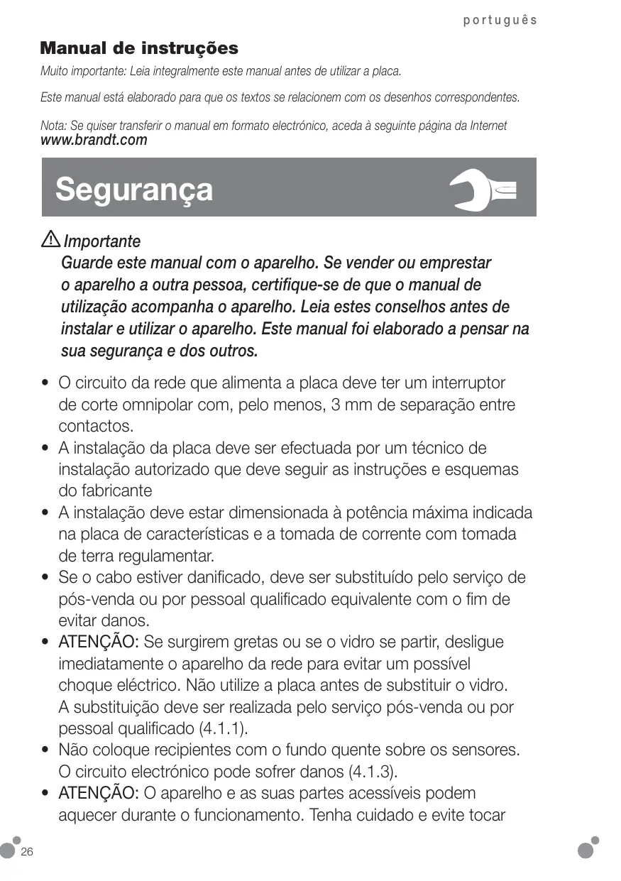 português Manual de instruções Muito importante: Leia integralmente este manual antes de utilizar a placa. Este manual está elaborado para que os textos se relacionem com os desenhos correspondentes. Nota: Se quiser transferir o manual em formato electrónico, aceda à seguinte página da Internet www.brandt.com Segurança Importante Guarde este manual com o aparelho. Se vender ou emprestar o aparelho a outra pessoa, certifique-se de que o manual de utilização acompanha o aparelho. Leia estes conselhos antes de instalar e utilizar o aparelho. Este manual foi elaborado a pensar na sua segurança e dos outros.