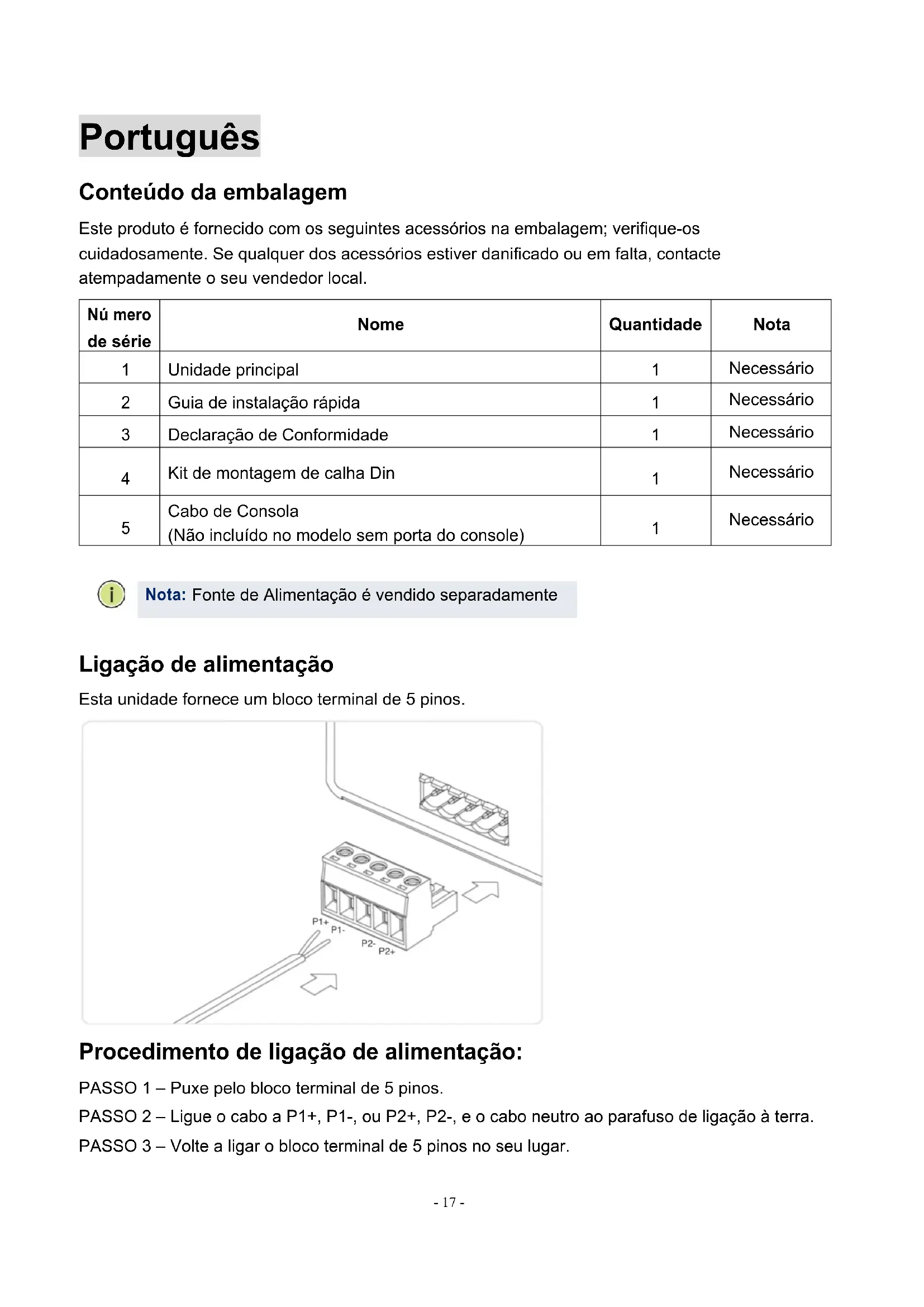 Ligação de alimentação Esta unidade fornece um bloco terminal de 5 pinos. Procedimento de ligação de alimentação: PASSO 1 – Puxe pelo bloco terminal de 5 pinos. PASSO 2 – Ligue o cabo a P1+, P1-, ou P2+, P2-, e o cabo neutro ao parafuso de ligação à terra. PASSO 3 – Volte a ligar o bloco terminal de 5 pinos no seu lugar. Nota: Fonte de Alimentação é vendido separadamente- 18 -