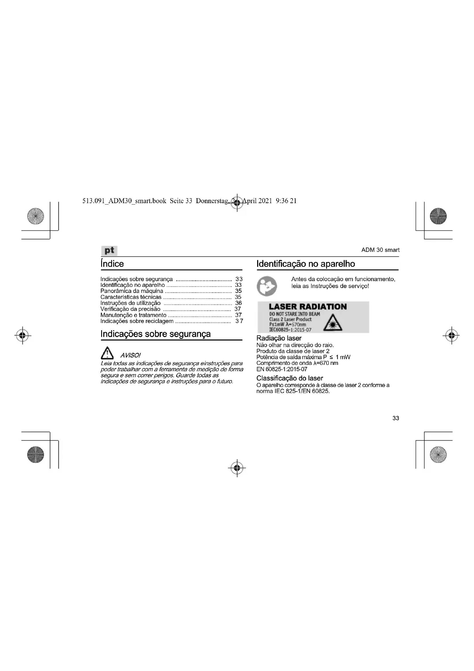 =670 nm EN 60825-1:2015-07 Classificação do laser O aparelho corresponde à classe de laser 2 conforme a norma IEC 825-1/EN 60825. 513.091_ADM30_smart.book Seite 33 Donnerstag, 22. April 2021 9:36 2134 ADM 30 smart Utilização de acordo com as disposições legais Esta ferramenta de medição destina-se à utilização profissional na indústria e em oficinas. O medidor de distâncias a laser destina-se a medir comprimentos, alturas e distâncias, bem como a determinar áreas. Medidor de distâncias a laser – Não direccione o raio laser para pessoas ou animais e não olhe para o raio laser. Esta ferramenta de medição cria radiação laser, que pode cegar pessoas. – A ferramenta de medição só deve ser reparada por técnicos qualificados e mediante utilização de peças de substituição originais. Deste modo, é possível garantir que a segurança da ferramenta é mantida. – Não permita que crianças utilizem a ferramenta de medição sem vigilância. Elas podem cegar pessoas inadvertidamente. – Não trabalhe com a ferramenta de medição em ambientes potencialmente explosivos, em que haja poeiras, gases ou líquidos inflamáveis. Na ferra- menta de medição, podem gerar-se faíscas que incendeiem o pó ou os vapores. – Caso sejam utilizados outros dispositivos de comando ou ajuste ou outros modos de procedimento que não os aqui indicados, tal pode provocar exposições perigosas à radiação. – Não inutilizar quaisquer dispositivos de segurança, nem remover quaisquer placas de indicação e advertência. – Antes da colocação em funcionamento, examinar o aparelho quanto a danos visíveis. Um aparelho que apresente danos não deve ser colocado em funcionamento. – Em caso de utilização sobre escadas ou escadotes, evitar posturas corporais anormais. Manter uma posição segura e um equilíbrio constante. 513.091_ADM30_smart.book Seite 34 Donnerstag, 22. April 2021 9:36 2135 ADM 30 smart Panorâmica da máquina 1 Janela de saída do laser 2 Lente receptora 3Visor 4 Tecla de Ligar/Tecla de medição/Modo 5 Tecla de Modo 6 Tecla de Desligar 7 Tomada de carga USB 8 Cabo de carga USB Características técnicas Medidor de distâncias a laser ADM 30 smart Díodo laser visível 670 nm Classe de laser 2 Intervalo de medição * 0,03–30 m Precisão * ± 3 mm Medições individuais (quantidade) ≤ 3000 Intervalo de temperatura – para funcionamento – para armazenamento 0 °C ... 40 °C –20 °C ... 60 °C 513.091_ADM30_smart.book Seite 35 Donnerstag, 22. April 2021 9:36 2136 ADM 30 smart
