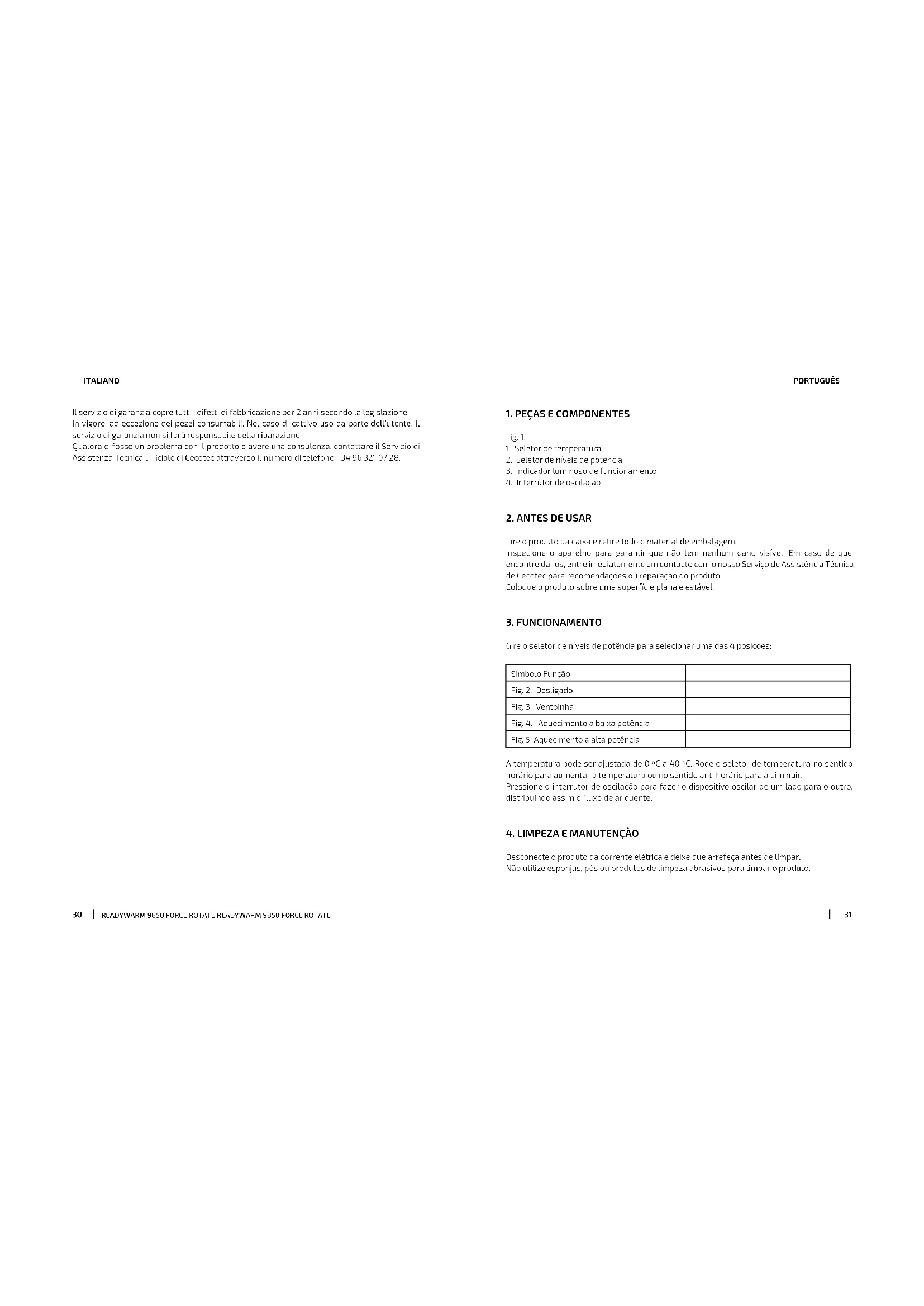 Este produto tem uma garantia de 2 anos desde a data de compra, sempre e quando se conserve e envie a fatura de compra, o produto esteja em perfeito estado físico e se lhe dê um uso adequado tal e como se indica neste Manual de Instruções. A garantia não cobrirá: Se o produto tiver sido usado fora da sua capacidade ou utilidade, maltratado, batido, exposto à humidade, submergido em algum líquido ou substância corrosiva, assim como qualquer outra falta atribuível ao consumidor. Se o produto foi desmontado, modicado ou reparado por pessoas não autorizadas pelo SAT ocial da Cecotec. Se a ocorrência foi originada pelo desgaste normal das peças devido ao uso. O serviço de garantia cobre todos os defeitos de fabricação durante 2 anos com base à legislação vigente, exceto peças consumíveis. Em caso de mal uso por parte do usuário, o serviço de garantia não se fará responsável pela reparação. Se em alguma ocasião deteta uma ocorrência com o produto ou tem alguma consulta, entre em contacto com o Serviço de Assistência Técnica ocial da Cecotec através do número de telefone +34 96 321 07 28.READYWARM 9850 FORCE ROTATE READYWARM 9850 FORCE ROTATE