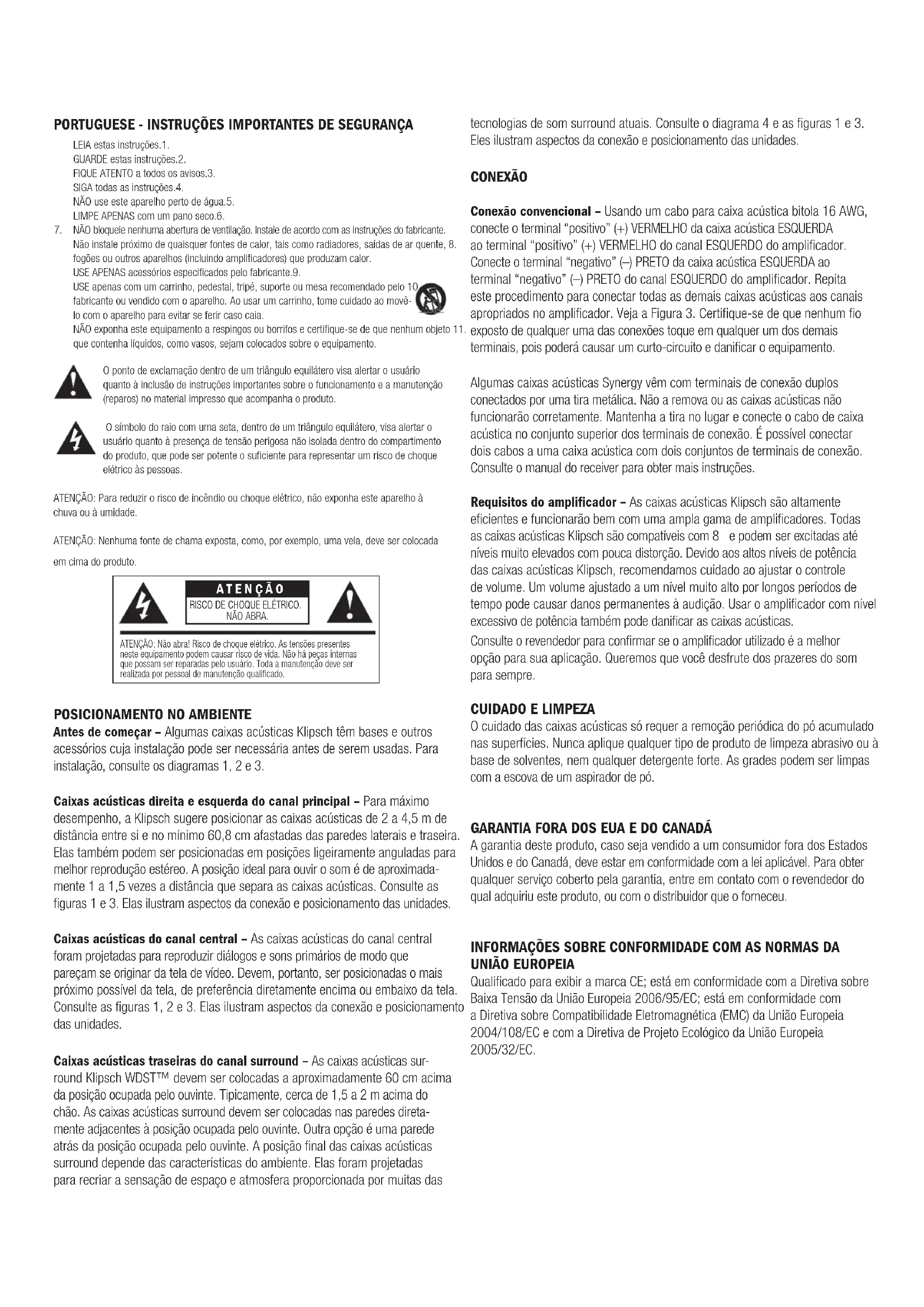 Antes de começar – Algumas caixas acústicas Klipsch têm bases e outros acessórios cuja instalação pode ser necessária antes de serem usadas. Para instalação, consulte os diagramas 1, 2 e 3. Caixas acústicas direita e esquerda do canal principal – Para máximo desempenho, a Klipsch sugere posicionar as caixas acústicas de 2 a 4,5 m de distância entre si e no mínimo 60,8 cm afastadas das paredes laterais e traseira. Elas também podem ser posicionadas em posições ligeiramente anguladas para melhor reprodução estéreo. A posição ideal para ouvir o som é de aproximada- mente 1 a 1,5 vezes a distância que separa as caixas acústicas. Consulte as figuras 1 e 3. Elas ilustram aspectos da conexão e posicionamento das unidades. Caixas acústicas do canal central – As caixas acústicas do canal central foram projetadas para reproduzir diálogos e sons primários de modo que pareçam se originar da tela de vídeo. Devem, portanto, ser posicionadas o mais próximo possível da tela, de preferência diretamente encima ou embaixo da tela. Consulte as figuras 1, 2 e 3. Elas ilustram aspectos da conexão e posicionamento das unidades. Caixas acústicas traseiras do canal surround – As caixas acústicas sur- round Klipsch WDST™ devem ser colocadas a aproximadamente 60 cm acima da posição ocupada pelo ouvinte. Tipicamente, cerca de 1,5 a 2 m acima do chão. As caixas acústicas surround devem ser colocadas nas paredes direta- mente adjacentes à posição ocupada pelo ouvinte. Outra opção é uma parede atrás da posição ocupada pelo ouvinte. A posição final das caixas acústicas surround depende das características do ambiente. Elas foram projetadas para recriar a sensação de espaço e atmosfera proporcionada por muitas das tecnologias de som surround atuais. Consulte o diagrama 4 e as figuras 1 e 3. Eles ilustram aspectos da conexão e posicionamento das unidades. CONEXÃO Conexão convencional – Usando um cabo para caixa acústica bitola 16 AWG, conecte o terminal “positivo” (+) VERMELHO da caixa acústica ESQUERDA ao terminal “positivo” (+) VERMELHO do canal ESQUERDO do amplificador. Conecte o terminal “negativo” (–) PRETO da caixa acústica ESQUERDA ao terminal “negativo” (–) PRETO do canal ESQUERDO do amplificador. Repita este procedimento para conectar todas as demais caixas acústicas aos canais apropriados no amplificador. Veja a Figura 3. Certifique-se de que nenhum fio exposto de qualquer uma das conexões toque em qualquer um dos demais terminais, pois poderá causar um curto-circuito e danificar o equipamento. Algumas caixas acústicas Synergy vêm com terminais de conexão duplos conectados por uma tira metálica. Não a remova ou as caixas acústicas não funcionarão corretamente. Mantenha a tira no lugar e conecte o cabo de caixa acústica no conjunto superior dos terminais de conexão. É possível conectar dois cabos a uma caixa acústica com dois conjuntos de terminais de conexão. Consulte o manual do receiver para obter mais instruções. Requisitos do amplificador – As caixas acústicas Klipsch são altamente eficientes e funcionarão bem com uma ampla gama de amplificadores. Todas as caixas acústicas Klipsch são compatíveis com 8 Ω e podem ser excitadas até níveis muito elevados com pouca distorção. Devido aos altos níveis de potência das caixas acústicas Klipsch, recomendamos cuidado ao ajustar o controle de volume. Um volume ajustado a um nível muito alto por longos períodos de tempo pode causar danos permanentes à audição. Usar o amplificador com nível excessivo de potência também pode danificar as caixas acústicas. Consulte o revendedor para confirmar se o amplificador utilizado é a melhor opção para sua aplicação. Queremos que você desfrute dos prazeres do som para sempre.