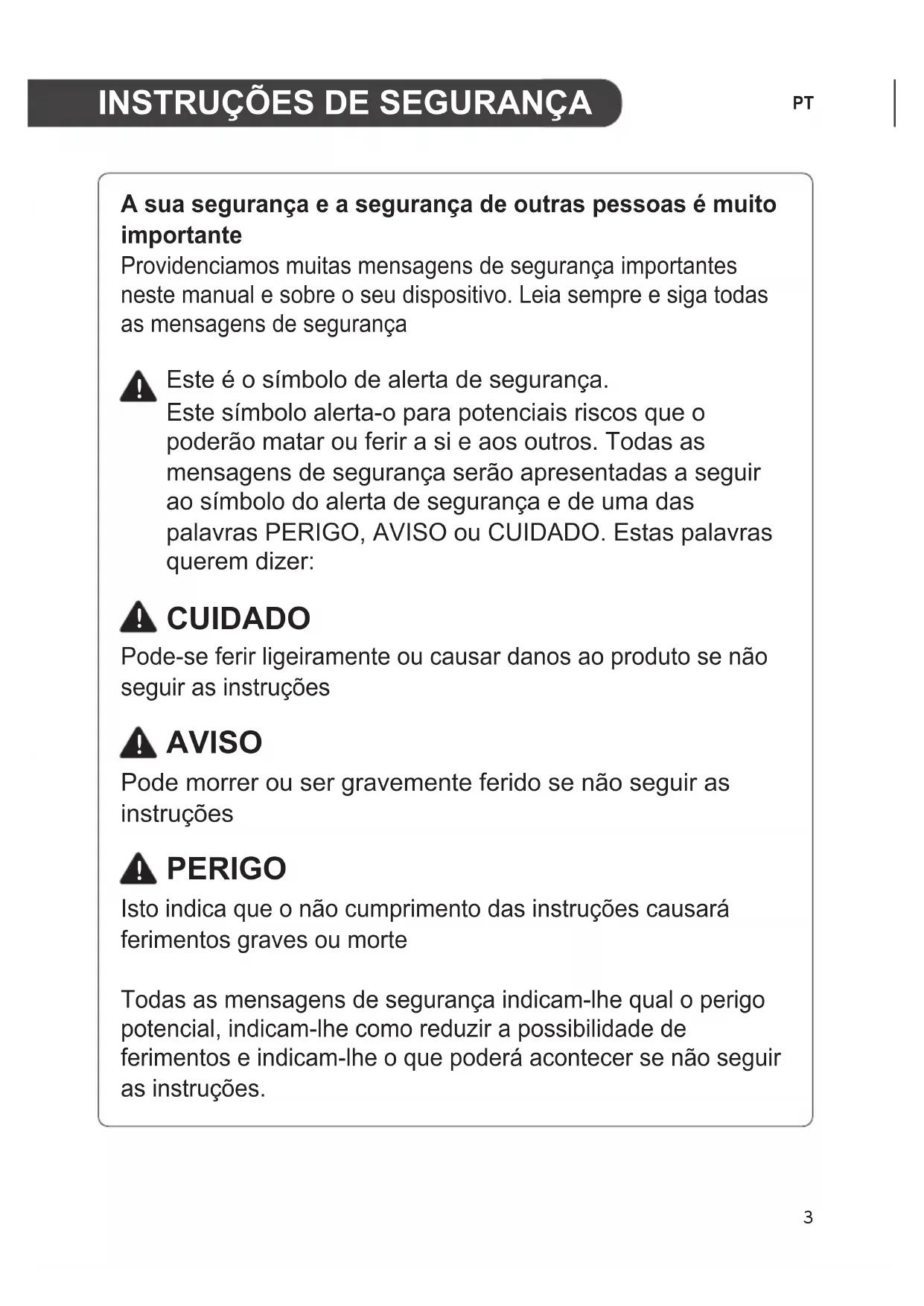 A sua segurança e a segurança de outras pessoas é muito importante Providenciamos muitas mensagens de segurança importantes neste manual e sobre o seu dispositivo. Leia sempre e siga todas as mensagens de segurança Este é o símbolo de alerta de segurança. Este símbolo alerta-o para potenciais riscos que o poderão matar ou ferir a si e aos outros. Todas as mensagens de segurança serão apresentadas a seguir ao símbolo do alerta de segurança e de uma das palavras PERIGO, AVISO ou CUIDADO. Estas palavras querem dizer: CUIDADO Pode-se ferir ligeiramente ou causar danos ao produto se não seguir as instruções AVISO Pode morrer ou ser gravemente ferido se não seguir as instruções PERIGO Isto indica que o não cumprimento das instruções causará ferimentos graves ou morte Todas as mensagens de segurança indicam-lhe qual o perigo potencial, indicam-lhe como reduzir a possibilidade de ferimentos e indicam-lhe o que poderá acontecer se não seguir as instruções.