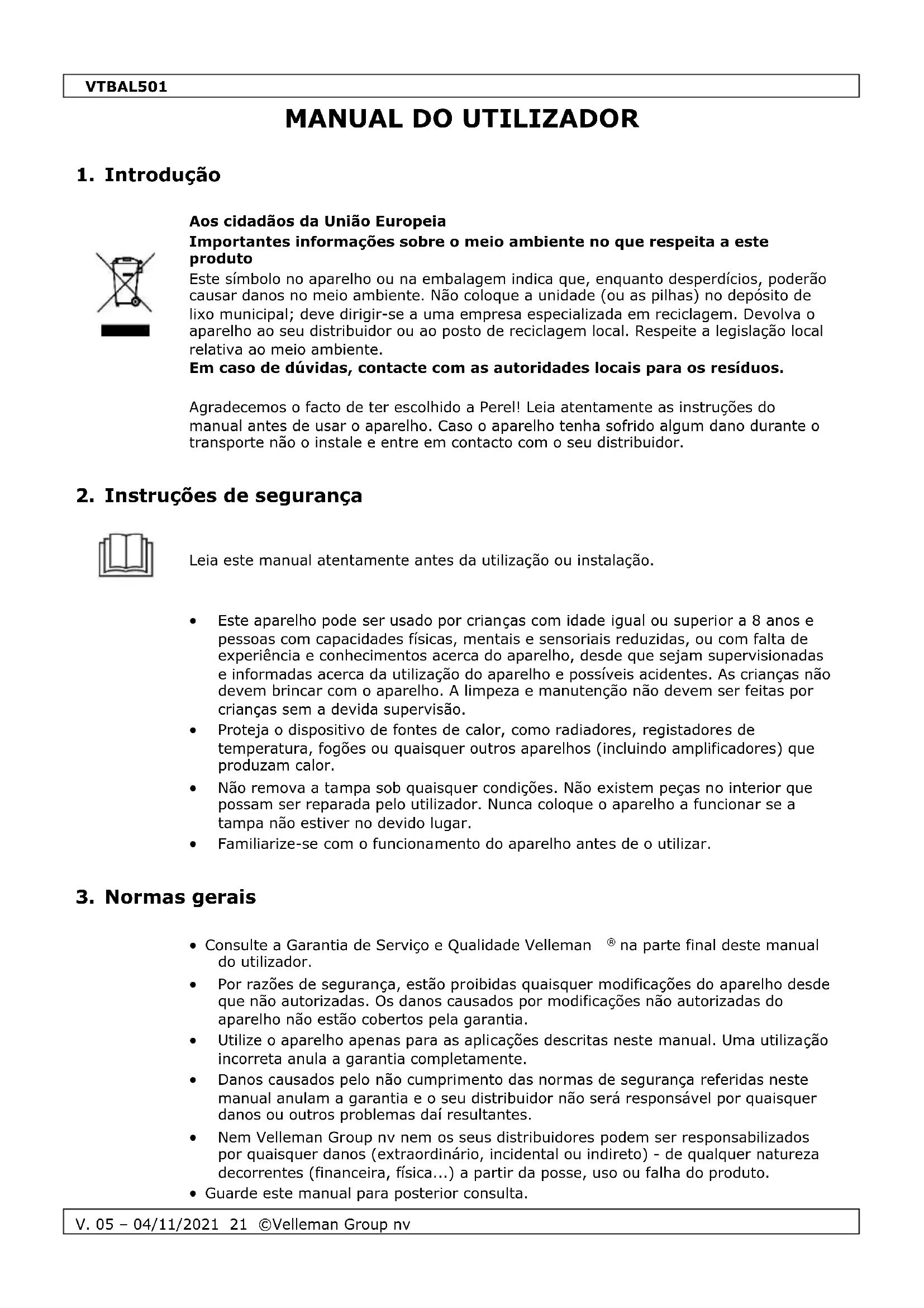 MANUAL DE UTILIZADOR VTBAL501 Perel
