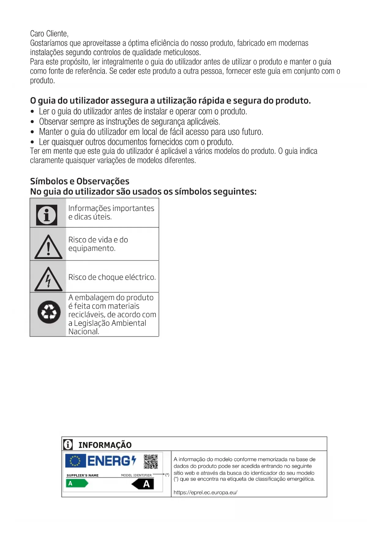 Informações importantes e dicas úteis. Risco de vida e do equipamento. Risco de choque eléctrico.A embalagem do produto é feita com materiais recicláveis, de acordo com a Legislação Ambiental Nacional.INFORMAÇÃO A informação do modelo conforme memorizada na base de dados do produto pode ser acedida entrando no seguinte sítio web e através da busca do identicador do seu modelo (*) que se encontra na etiqueta de classificação emergética.https://eprel.ec.europa.eu/
