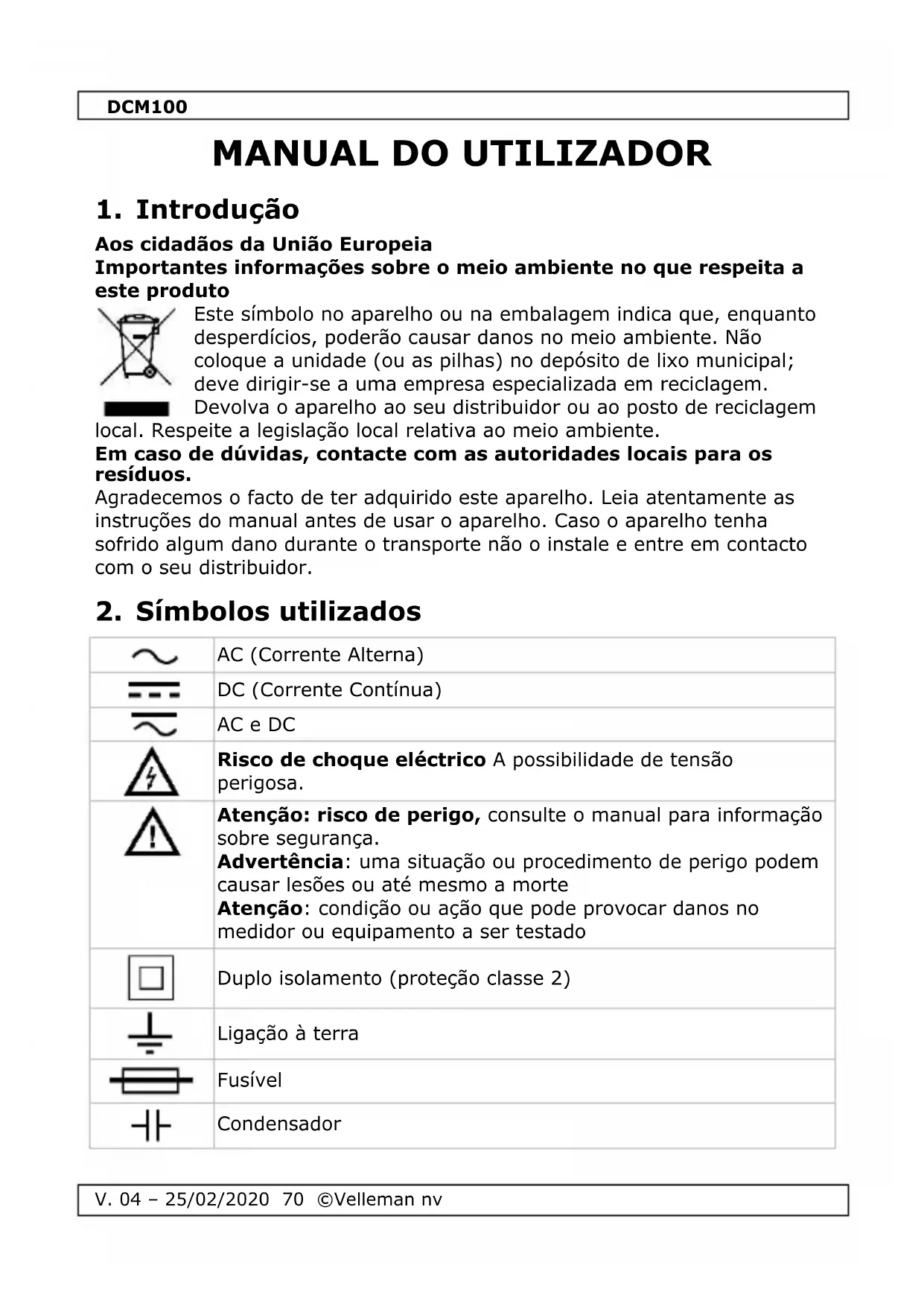 Encontre gratuitamente o manual do aparelho DCM100 VELLEMAN em formato PDF.