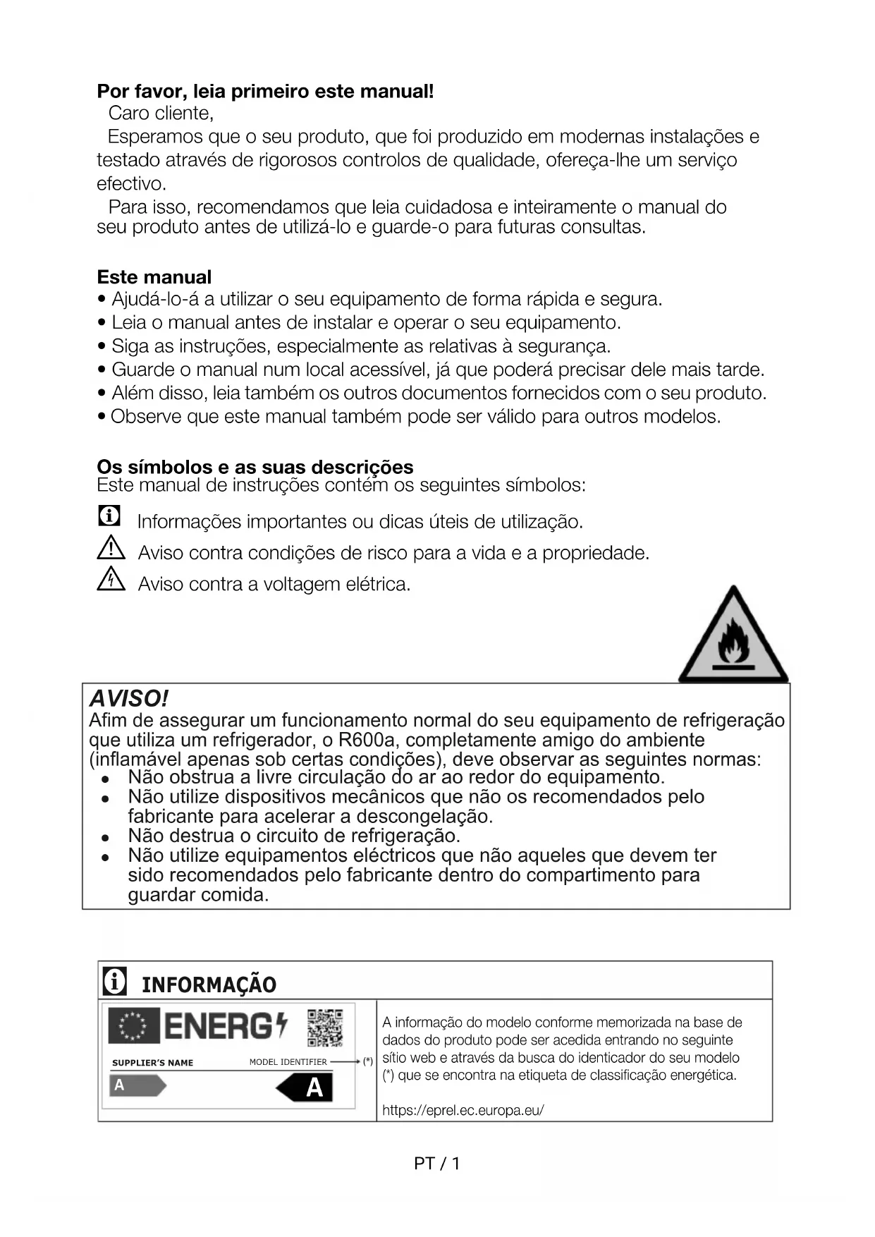 - Observe que este manual também pode ser válido para outros modelos.Os símbolos e as suas descriçõesEste manual de instruções contém os seguintes símbolos: C Informações importantes ou dicas úteis de utilização. A Aviso contra condições de risco para a vida e a propriedade. B Aviso contra a voltagem elétrica. AVISO! Afim de assegurar um funcionamento normal do seu equipamento de refrigeração que utiliza um refrigerador, o R600a, completamente amigo do ambiente (inflamável apenas sob certas condições), deve observar as seguintes normas: